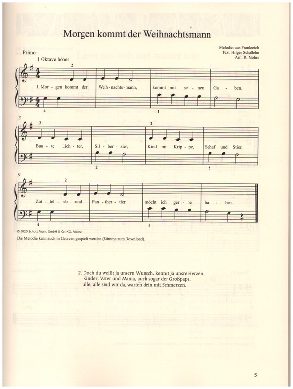 Mohrs, Rainer, arr. Draths, Willi, ed Magolt, Marianne, ed 33 beliebte Weihnachtslieder für Klavier vierhändig Mit leicht spielbaren Bearbeitungen und einigen Zusatzstimmen für Klavier sechshändig Die Reihe Morgen kommt der Weihnachtsmann ermöglicht das Spiel von Weihnachtsliedern mit mehreren Instrumenten und möchte das gemeinsame Musizieren fördern. Alle Ausgaben sind untereinander kombinierbar. Die neue vierhändige Ausgabe ist für beide Klavierspieler leicht spielbar und kann im Unterricht schon nach wenigen Wochen eingesetzt werden. Für den Primo-Spieler werden einige Melodien auf die beiden Hände aufgeteilt, andere Lieder sind im Oktavabstand zu spielen (Diabelli-Prinzip) oder haben eine leichte zweite Stimme. Auch der Secondo-Part kann bequem von Anfängern gespielt werden. Das Heft ist daher auch für das Blattspiel, für den Unterricht und für Klavierliebhaber geeignet. Alle Jahre wieder Am Weihnachtsbaum die Lichter brennen Auf dem Berge, da wehet der Wind Es ist ein Ros' entsprungen Es ist für uns eine Zeit angekommen Fröhliche Weihnacht überall Gloria Guten Abend, gut Nacht Heiligste Nacht Herbei, o ihr Gläubigen Ihr Hirten, erwacht Ihr Kinderlein, kommet Inmitten der Nacht Jingle Bells Kindelein zart Kling, Glöckchen, klingelingeling Kommet, ihr Hirten Lasst uns froh und munter sein Leise rieselt der Schnee Maria durch ein' Dornwald ging Morgen, Kinder, wird's was geben Morgen kommt der Weihnachtsmann O du fröhliche, o du selige O laufet, ihr Hirten O Tannenbaum Stille Nacht, heilige Nacht Stille, stille, kein Geräusch gemacht Süßer die Glocken nie klingen Tochter Zion Vom Himmel hoch da komm ich her Was soll das bedeuten We wish you a merry Christmas Zu Bethlehem geboren