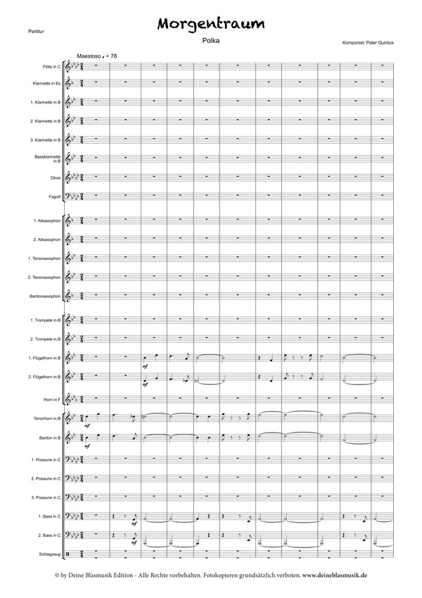 Polka Der Morgen verdrängt die Nacht und erhellt langsam den Tag. Wie zwitschernde Vögel begrüßen die Flöten und Klarinetten mit ihren spielerischen Einwürfen die aufgehende Sonne. Flotte und fröhliche Melodien der Tenor- und Flügelhörner lassen im Trio den Tag erwachen. Die prägenden Akzente der Posaunen verdrängen die letzten Reste der Nacht. Starten Sie mit dieser beschwingten Polka von Peter Quintus wunderbar in den neuen Tag!