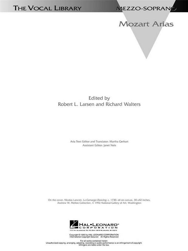 Va l'error mio palesa (Mitridate) Son reo l'error confesso (Mitridate) Non so piu cosa son (Figaro) Cvoi che sapete (Figaro) Il capro a la capretta (Figaro) Smanie implacabili (Cosi fan tutte) E amore un ladroncello (Cosi fan tutte) Parto parto (Tito) Torna di tito a alto (Tito) Deh per questo istante solo (Tito) Larsen, Robert L., ed