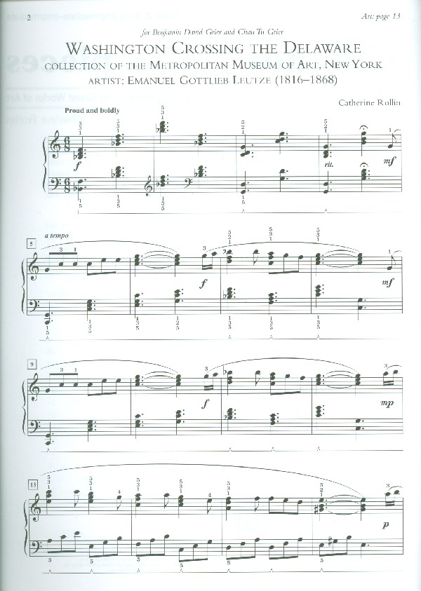 10 Piano Solos inspired by great Works of Art Car and Hunting Fox Cirque (Circus) Girl with a Pearl Earring Jeunes filles au piano (Young Girls at the Piano) La charmeuse de serpents (The Snake Charmer) Noah's Ark Nocturne in Black and Gold---The Falling Rocket Primavera (Spring) Sunrise on the Matterhorn Washington Crossing the Delaware