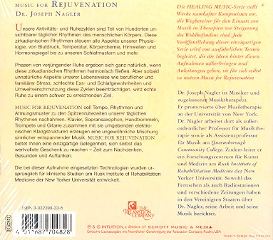Healing Music HörBalsam für die Sinne. Diese Produktion lässt sich von zwei Seiten genießen. Zum einen ist 'Music For Rejuvenation' ein 'musiktherapeuthisches' Werk, das auf langjährigen wissenschaftliche Forschungen aufbaut. Speziell (elektronisch) geschaffene Klänge und Musiktechniken werden verwendet, um die beruhigenden Klangstrukturen zu erzeugen, die der ganzen CD zugrunde liegen, -- eine Technologie, die ursprünglich für klinische Studien am Rusk Institute of Rehabilitation Music des New York University Medical Center entwickelt wurde. Diese 'harmonisierenden Wellen' verbindet die CD mit 'traditioneller' Musik, die stilistisch zwischen Jazz und Soundtrack-artigem Repertoire liegt. Eine ungewöhnliche Mischung gefühlvoller, entspannender Melodien, eingespielt von hervorragenden Musikern (mittels Klavier, Sopransaxophon, Handtrommeln, Trompete, Gitarre und Violine), die nicht nur als 'functional music' überzeugt. Diese Platte läßt sich auch vom rein musikalischen Standpunkt her trefflich als Genussmittel erleben.