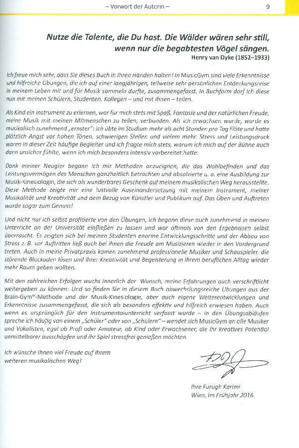 Music Gym mit Übungen aus Musik-Kinesiologie und nach Brain-Gym Beinahe jedem Musiker wird er schon einmal begegnet sein, der typische Spielverderber Lampenfieber, ausgelöst durch übersteigerten Leistungsdruck und Stress in Momenten, in denen der musikalische Ausdruck und die Freude daran im Vordergrund stehen sollten. Doch nicht nur in Auftrittssituationen können psychische und physische Blockaden ein unbelastetes Muszieren beeinträchtigen. Mithilfe der ganzheitlichen Techniken der Musik-Kinesiologie gelingt es mittlerweile vielen Künstlern, zurück zu innerer Balance und neuer Ausdruckskraft zu finden. Die Soloflötistin und Pädagogin Furugh Karimi sammelt seit mehr als 20 Jahren Erfahrungen auf diesem Gebiet, u. a. als Dozentin an der Wiener Universität für Musik. MusicGym enthält eine Zusammenstellung erfolgreich erprobter, abwechslungsreicher, von der Autorin weiterentwickelter Übungen aus der Brain-Gym«-Methode sowie der Musik-Kinesiologie, anschaulich aufbereitet für Unterricht und Praxis.
