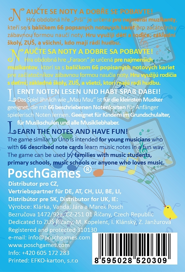 Ein originelles Kartenspiel für 2-6 Spieler, das für die kleinsten oder gerade erst beginnenden Musiker gedacht ist. Das Spiel eignet sich für die ganze Familie, vor allem für Kinder, die Noten lernen. Es ist auch eine geeignete Unterrichtergänzung für zum Beispiel Kunst- und Grundschulen. Tauche ein in eine magische Welt der Musiknoten, von der man nie genug bekommen kann. Jede Note ist wichtig und vielleicht entscheidet sie das ganze Spiel. Verwende deinen Changer, um die Oktave zu verändern und lasse alle Spieler eine Runde lang durch die ganze Pause aussetzen. Durch das Legen einer Sechzehntelpause muss der Gegner vier Karten ziehen. Wiederhole dies, bis keine Karten mehr auf der Hand sind und gewinne! Kennst du Noten und andere Musiksymbole? Noch nicht? Das ist egal! Dieses Spiel enthält einen mit Notennamen beschrifteten Kartensatz für Anfänger, der hilft, die Noten kennenzulernen. Fangt an zu Spielen! Und wer weiß vielleicht kannst du schon bald dein Lieblingsstück vom Blatt auf deinem Musikinstrument spielen, ohne viel nachdenken zu müssen. Spieldauer ca. 20 Minuten ab ca. 5 Jahren