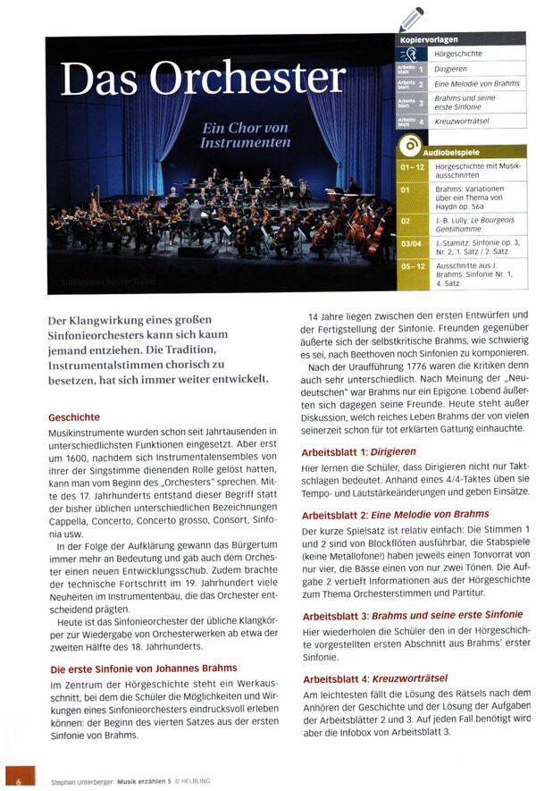 Fertige Unterrichtsbausteine für das Fach Musik - 7 Hörgeschichten mit Kopiervorlagen 4.-7. Schuljahr Band 5 zur beliebten Reihe Musik erzählen bietet neue Themen und Lernbereiche für den Musikunterricht. Diese stehen als unmittelbar einsetzbare Unterrichtsbausteine zur Verfügung, die völlig unkompliziert z.B. auch von fachfremd Unterrichtenden oder in Vertretungsstunden eingesetzt werden können. Musik erzählen vermittelt Grundthemen des Musikunterrichts in neuer, schülerfreundlicher Form: der Einstieg erfolgt jeweils über eine unterhaltsame Hörgeschichte Arbeitsblätter schulen und vertiefen wichtige Kompetenzbereiche des Musikunterrichts: Singen und Musizieren, erkennendes Musikhören, Verstehen von Musik und vieles mehr. Die Lösungen sind im Heft enthalten. Dem Heft liegt eine CD mit 62 Tracks bei. Lernbereiche in Heft 5: 1) Das Orchester - Ein Chor von Instrumenten 2) Der Feuervogel - Ein Ballett-Klassiker des 20. Jahrhunderts 3) Die barocke Suite - Vom Tanzpaar zur höfischen Unterhaltungsmusik 4) Bilder einer Ausstellung - Mehr Musik als Malerei 5) West Side Story - Die Mutter aller Musicals 6) Beethovens Fünfte - Sein meistgespieltes Werk 7) Johann Strauss - ein Weltstar des 19. Jahrhunderts