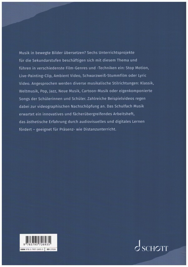 Sekundarstufe Musik Musik in bewegte Bilder übersetzen? Sechs Unterrichtsprojekte für die Sekundarstufe I und II beschäftigen sich mit diesem Thema und führen in verschiedenste Film-Genres und -Techniken ein: Stop Motion, Live-Painting-Clip, Ambient Video, Schwarzweiß-Stummfilm oder Lyric Video. Angesprochen werden diverse musikalische Stilrichtungen: Klassik, Weltmusik, Pop, Jazz, Neue Musik, Cartoon-Musik oder eigenkomponierte Songs der Schülerinnen und Schüler. Zahlreiche Beispielvideos regen dabei zur videografischen Nachschöpfung an. Das Schulfach Musik erwartet ein innovatives und fächerübergreifendes Arbeitsheft, das ästhetische Erfahrung durch audiovisuelles und digitales Lernen fördert geeignet für Präsenz- wie Distanzunterricht.