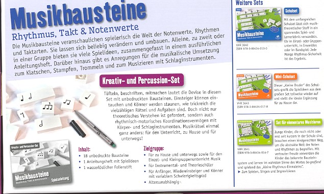 Rhythmus, Takt und Notenwerte mit vielen Anleitungen und Spielideen 18 unbedruckte Bausteine Anleitungsheft mit Rätselaufgaben und Percusion-Teil für Body-Percussion und Orff-Instrumente wasserlöslicher Folienstift