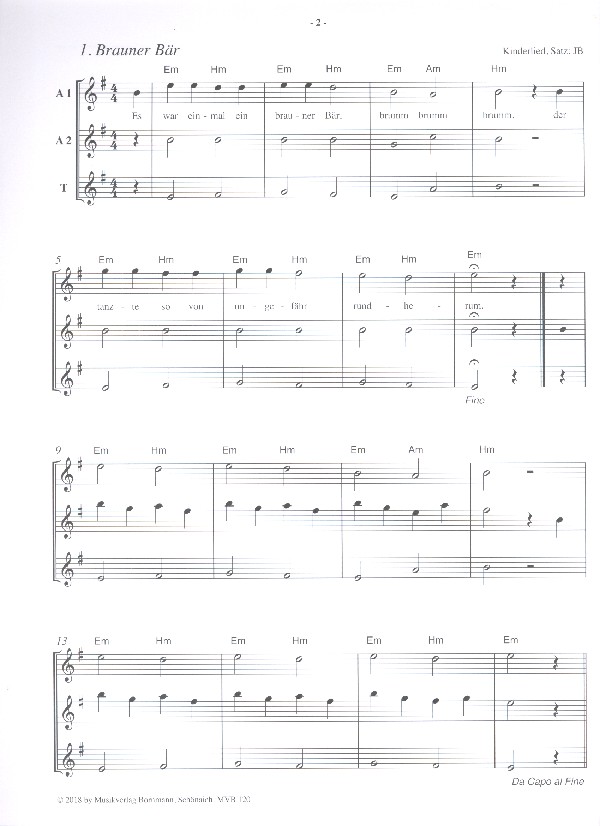 Bornmann, Johannes, arr. Trio Spielkreis Brauner Bär Wir sind zwei Musikanten Taischan (aus China) Villanella (aus Italien) Tiritomba (aus Italien) Fing mir eine Mücke heut (aus Ungarn) Himmelsau licht und blau Flow gently, sweet Afton (aus Nordamerika) Amazing Grace (aus England) Minun koltani (aus Finnland) Toinot Arbeau: Branle d'Escosse Der Maien ist kommen (aus der Schweiz) Bella Bimba (aus Italien) Lullaby (aus Irland) Eine schöne Rose (aus Schweden) Der Winter ist vergangen (aus der Schweiz) Toinot Arbeau: Pavane Johann Hermann Schein: Allemande Oh when the Saints (aus Nordamerika) Tarantella (aus Italien) Sah ein Knab ein Röslein stehn When Johnny comes marching home (aus Nordamerika) Die Königin des Himmels (aus England) Widele, wedele (aus Schwaben) Greensleeves (aus England) Im Tempel des Herrn (aus Finnland) Robert Schumann: Nordisches Lied Johannes Bornmann: Kater Felix Und jetzt gang i ans Petersbrünnele (aus der Steiermark) Clemens non Papa: Der Trommelbube Giovanni Gastoldi: In dir ist Freude Wenn die Bettelleute tanzen (aus Schlesien) Marc-Antoine Charpentier: Triumphmarsch