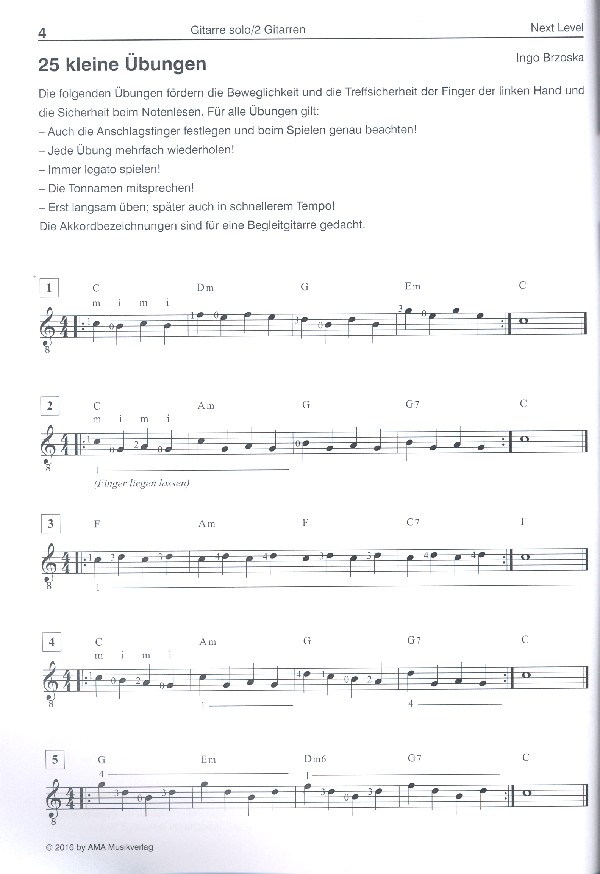 Funschool Musikstücke und Übungen als Ergänzungen zu einer Gitarrenschule »Next Level« enthält Musikstücke und Übungen für den Gitarrenunterricht und begleitet den Übergang von der Unterstufe zur Mittelstufe. Als Voraussetzungen für den Einsatz dieses Heftes sollten bekannt sein: die Töne der ersten Lage grundsätzliche Anschlagsformen (Daumenanschlag, Wechselschlag, Tirando, Apoyando) Notenwerte: Ganze, Halbe, Viertel und Achtel Das Heft ist als Ergänzung zu einer Gitarrenschule gedacht und eignet sich sowohl für den Gruppen als auch für den Einzelunterricht. Für den vielseitigen Einsatz sind die meisten Stücke flexibel ausführbar vom Solo bis hin zum Quartett: Bei einigen Stücken gibt es verschiedene ausnotierte Stimmen, teilweise kann mit Hilfe der Akkordsymbole eine einfache Begleitstimme gespielt werden. Nach dem Studium der allgemeinen Musikerziehung, der Instrumentalpädagogik Gitarre und dem Besuch zahlreicher Meisterkurse (bei Karl Scheit, Alexandre Lagoya und Hubert Käppel) beschäftigte sich Ingo Brzoska mit dem frühinstrumentalen Gitarrenunterricht (ab ca. 6 Jahren) und hat mit der AMA Gitarrenschule für Kinder eine Schule geschrieben, die sich an eine Altersgruppe zwischen 6 und 10 Jahren richtet. Mit seinem neuen Buch Next Level hat der Autor ein Heft mit vielen Spielstücken geschrieben, das den Übergang von der Unter- zur Mittelstufe begleitet. Gleichzeitig kann dieses Heft als Zusatzmaterial zu seiner AMA Gitarrenschule für Kinder, An die Saiten fertig los! oder auch Käppels Gitarrenschule und Jens Kienbaums Abenteuer Gitarre eingesetzt werden. Vorausgesetzt werden Kenntnisse über die Töne der ersten Lage, die Notenwerte von Achtel bis Halbe und die grundsätzlichen Anschlagsarten (Daumenanschlag, Wechselschlag, Tirando, Apoyando). Als neue Techniken werden im Laufe des Bandes Bindeübungen, Akkordanschläge, Aufschlagarten und Lagenwechselübungen besprochen. Da alle Spielstücke variabel aufgeführt werden können, ob als Solostück oder in Gruppen vom Duo bis zum Quartett ist diese Schule nicht nur für den Gruppenunterricht sondern auch im Einzelunterricht einsetzbar. Hinweise zu formalen Abläufen laden zum Experimentieren ein und ermöglichen es dem Lehrer die Ensemblestücke in unterschiedlichen musikalischen Abläufen aufführen zu lassen, wenn z. B. bei Wiederholungen die Stimmen innerhalb der Gruppe getauscht werden oder Solo- mit Ensemblepassagen wechseln.