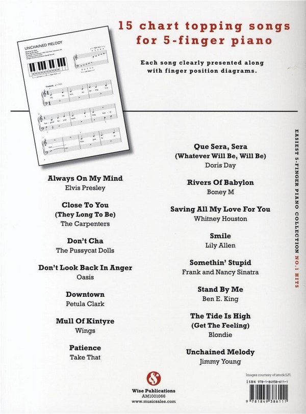 Easiest 5-Finger Piano Collection 15 Chart Topping Songs Always on my Mind Close to You Don't cha Don't look back in Anger Downtown Mull of Kintyre Patience Que sera sera Rivers of Babylon Saving all my Love for You Smile Somethin' stupid Stand by me The Tide is high Unchained Melody