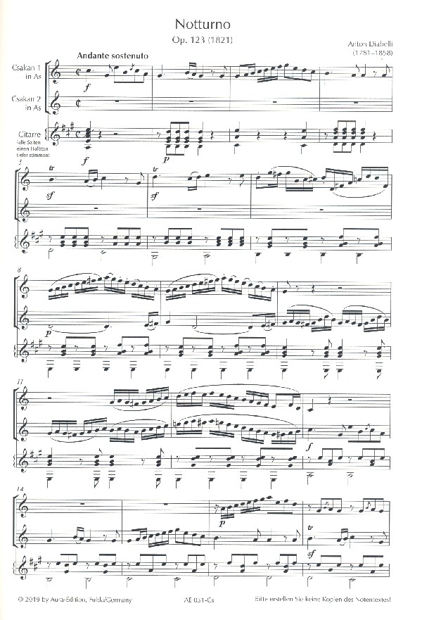 Tarasov, Nikolai, ed Csakan Die anspruchs- und fantasievolle Komposition zählt zu den besten originalen Kammermusikwerken der romantischen Blockflöte. Diabelli widmete sie Ernest Krähmer, dem bedeutendsten Csakanspieler seiner Epoche. Das fünfsätzige Notturno ist abwechslungsreich gestaltet und verrät das ganze Können des Komponisten mit so manchem Seitenblick auf Schubert. Die vorliegende Neuausgabe macht das Werk dem Blockflötenrepertoire wieder zugänglich.