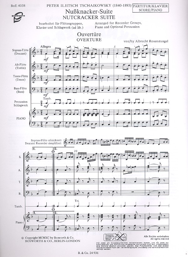 The celebrated Nutcracker Suite arranged for a Recorder ensemble with Piano and optional Percussion by Albrecht Rosenstengel.
