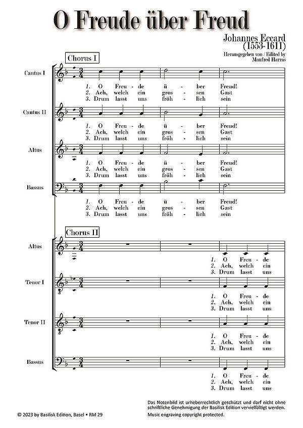Alte Musik - Early Music Weihnachtliche Motette Johannes Eccards weihnachtlicher Doppelchor "O Freude über Freud" ist als Nummer 9 in der Ausgabe "Erster Theil der Preussischen Fest-Lieder, vom Advent biß Ostern, mit 5.6.8 Stimmen" enthalten. Die erste Auflage dieses Druckes erschien im Jahre 1642 bei Wendelin Bodenhausen in Elbing. Der Text wird Georg Reiman zugeschrieben. Eigentlich als Vokalsatz gedacht, kann dieser Doppelchor auch vokal/instrumental oder rein instrumental mit Blockflöten (SSAB/ATTB), Violen da Gamba oder mit anderen Melodie-Instrumenten ausgeführt werden. Besonders klangvoll ist auch eine Besetzung im Broken Consort, bei der beispielsweise der erste Chor mit Blockflöten und der zweite Chor mit Streichern besetzt werden kann.