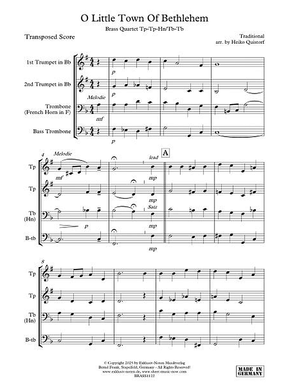 Heiko Quistorf schuf vor kurzem einige Bearbeitungen bekannter Weihnachtslieder für vier Blechbläser und verpasste den Liedern dabei stets ein neues Gewand. Mit dabei ist das in den USA sehr beliebte O Little Town Of Bethlehem. Davon abgeleitet wurde auch ein Arrangement für Saxophonquartett, welches mit der vorliegenden Ausgabe für Blechbläserquartett kompatibel ist. Nach der Einleitung präsentiert zunächst die Posaune (alternativ auch French Horn) das Thema und dominiert somit innerhalb des vierstimmigen Satzes. Im weiteren Verlauf wechseln sich die Stimmen mit der Führung ab. Teil C erfährt eine Steigerung durch den Tonartwechsel, und ab hier kommt der vierstimmige Satz in leicht modernerem Gewand daher. Das Arrangement ist eingängig und wunderschön gesetzt. Es sollte bei guter Intonation keine großen Probleme bereiten. Die Trompetenstimmen sowie die gesamte Partitur liegen zusätzlich zur transponierten Version auch klingend vor.