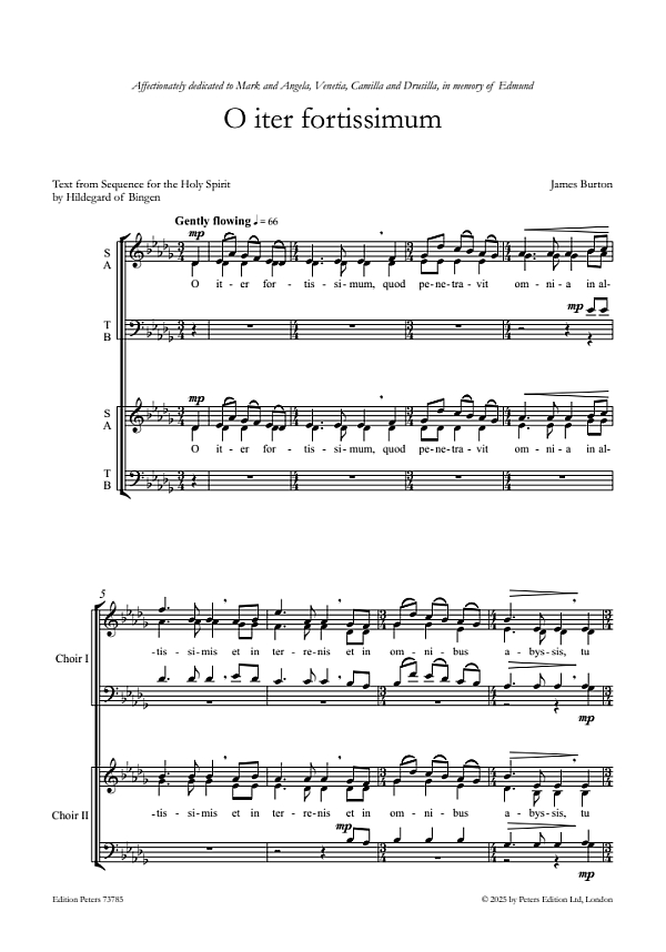 "I was invited by Edmund?s Trust to create a new piece in 2024 for use in an ecclesiastical setting, to join a growing portfolio of pieces composed in memory of Edmund Bridges. Earlier in the year I had attended a service at New College Oxford, and the Dean read as a prayer a translation of Hildegard?s Sequence for the Holy Spirit, and I knew immediately that these inspiring words would be a good starting point for the new piece. I?m grateful to Dr Venetia Bridges for supplying the translation which appears at the front of the score, and also for her encouragement in choosing this text, not least sharing that her brother Edmund would have approved of the choice. We also discussed his work as a teacher, and how the text would have resonated with him, and thus in the third section of the piece one of the two choirs acts as the ?teacher', and the other follows as a nervous student a bar behind, but growing in confidence as it explores and expands upon the ideas set out by the teacher. The music was created for a choir like that at New College Oxford in mind, and I had also been redigesting William Harris?s New College piece Faire is the Heaven, a piece which I?ve known since I was young. There are passing similarities: there are two SATB choirs used antiphonally, a home key of D flat major and some enharmonic shifts at structural moments. I studied Hildegard?s original sequence for these beautiful words, and two gestures from that made their way in to the new music: Hildegard?s first interval is a rising fifth which becomes a prominent feature here, and her final melodic shape of a descending 4th followed by an ascending major 2nd is replicated as the open ended melodic cadence. James Burton, November 2024"