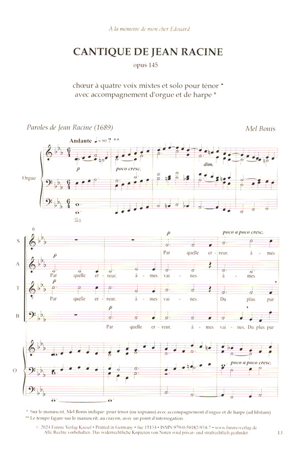 Twentieth Century T41) Cantique de Jean Racine et autres cantiques 2 Cantiques de prèmiere communion O mystère d*amour op.146 Troupe innocente op.142 Prière de Noel op.44 pour choeur mixte a cappella