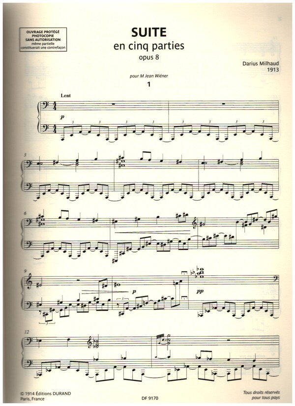 Suite en 5 parties op.8 Mazurka Sonate no.1 op.33 Tango des Fratellini (Le boeuf sur le toit) Printemps no.1 op.25 Printemps no.2 op.66 Saudades do Brasil op.67 Caramel mou op.68 L'Automne op.115 Les songes op.124 4 Romances sans paroles op.129 Le tour de l'exposition op.162 Hymne de glorification op.331 Exercice