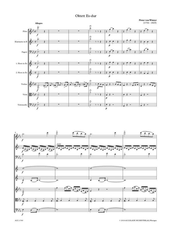 | Untertitel: | für Flöte,Klarinette, Fagott, 2 Hörner, Violine, Viola und Violoncello Partitur und Stimmen |