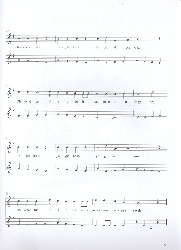 Korn, Uwe, ed Malycheva, ed Die schönsten Volks- und Kinderlieder Lieder für Feste und Feiern: Viel Glück und viel Segen Happy Birthday To You Jingle Bells Lieder aus Film und Fernsehen: Hey, Pippi Langstrumpf Hurra, hurra, der Pumuckl ist da Eine Insel mit zwei Bergen Spaßlieder: Drei Chinesen mit dem Kontrabass Auf der Mauer, auf der Lauer Meine Tante aus Marokko Der Cowboy Jim aus Texas Mein Hut, der hat drei Ecken If You're Happy Jahreszeitenlieder: Frühling: Es tönen die Lieder I Like The Flowers Alle Vögel sind schon da Sommer: Lachend, lachend lachend Summ, summ, summ Trarira, der Sommer, der ist da Herbst: He-jo, spann den Wagen an Bunt sind schon die Wälder Der Bratapfel Das Laub fällt von den Bäumen Winter: Leise rieselt der Schnee Schneeflöckchen, Weißröckchen Es ist für uns eine Zeit angekommen Morgen- und Abendlieder: Danke für diesen guten Morgen Der Mond ist aufgegangen Weißt du, wie viel Sternlein stehen La-le-lu Lieder aus aller Welt: Bruder Jakob (Frère Jacques) Kalinka Auld Lang Syne Old Mac Donald What Shall We Do Shalom chaverim Üsküdara gideriken Bella Bimba La Cucaracha Go Down Moses O When The Saints