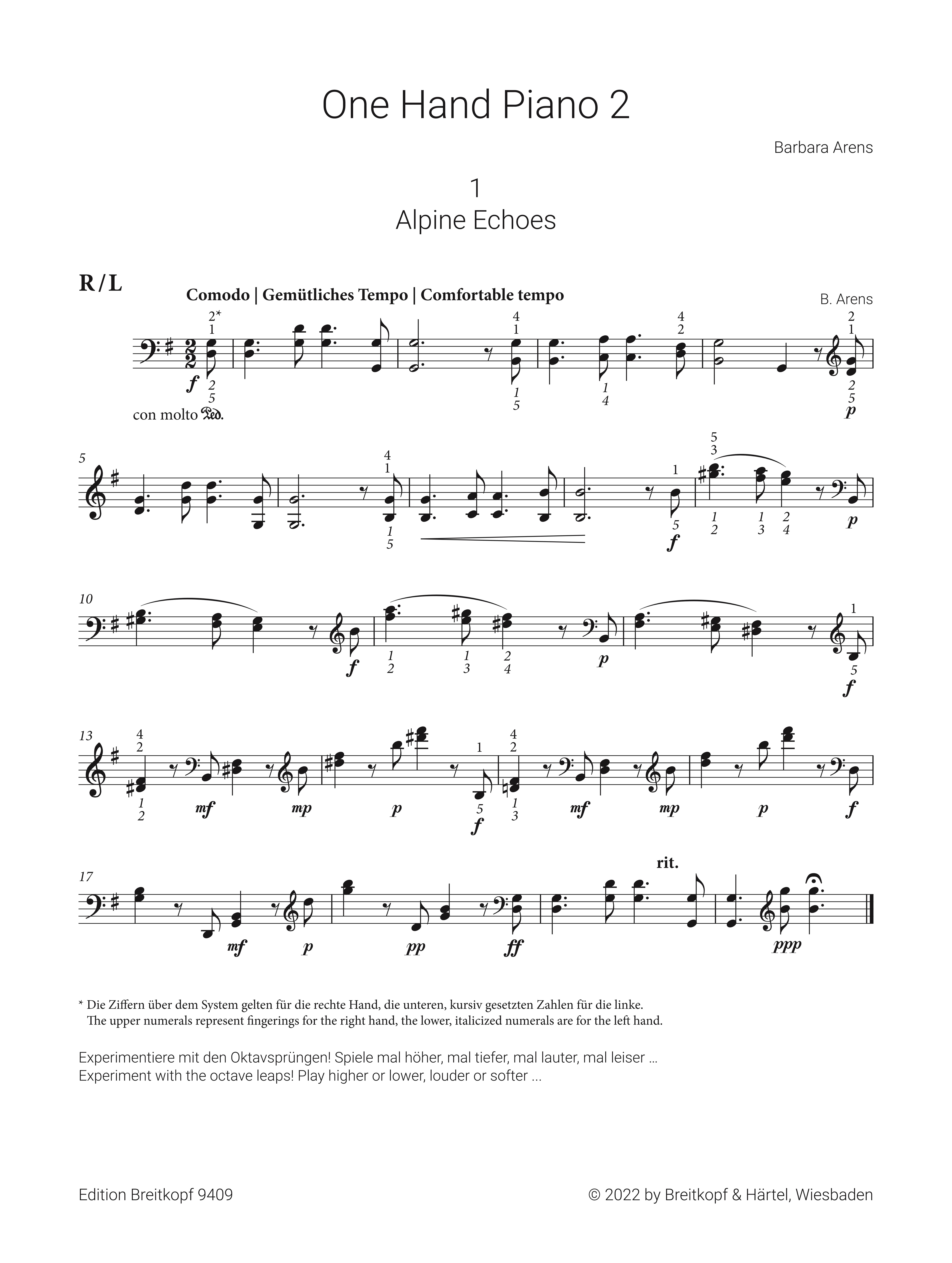 Nichts ist so erfolgreich wie der Erfolg! Die große Popularität von Barbara Arens One Hand Piano (EB 8646) hat die Komponistin dazu ermutigt, eine weitere Sammlung von Stücken für die linke oder rechte Hand allein vorzulegen. Die vierzig Stücke im Tango-, Walzer oder Gavotte-Rhythmus umfassen verschiedene Stilrichtungen wie z. B. Rock, keltische Musik, Jazz und Filmmusik und klingen mal heiter, mal poetisch, mal gespenstisch, dann wieder romantisch. Eine Besonderheit stellen die vier einhändigen Stücke von Nikolas Sideris, Alison Mathews, Garreth Brooke und Clemens Christian Poetzsch dar, die der Sammlung eine zusätzliche zeitgenössische Tiefe verleihen. Originalstücke für eine Hand allein von C.P.E. Bach, Abbé Vogler, Farinelli, Mandyczewski und Sartorio sowie Bearbeitungen von Volksliedern und einer Cello-Suite von Max Reger dürften eine willkommene und zufriedenstellende Herausforderung für all jene sein, die ihre schwächere Hand verbessern möchten oder vorübergehend oder dauerhaft mit nur einer Hand spielen können.