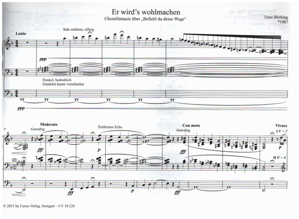 Deutscher Musikrat, ed Michaelis, Kord, ed Mailänder, Richard, ed Im Jahr der Orgel 2021, das von den Landesmusikräten ausgerufen wurde, und gleichzeitig dem zweiten Corona-Jahr haben der Deutsche Musikrat, die Evangelische Kirche in Deutschland und die Deutsche Bischofskonferenz das Projekt Orgelmusik in Zeiten von Corona ins Leben gerufen. Zentrale Anliegen des von der Beauftragten für Kultur und Medien, Prof. Monika Grütters, geförderten Projekts sind die Unterstützung zeitgenössischer Musik und freischaffender Komponist*innen in diesen Zeiten sowie die Wiederbelebung der Live-Musik. Katholische und evangelische Kirche kennen die Tradition, dass in Krisenzeiten zum Trost der Gläubigen neue Werke komponiert und in Gottesdiensten aufgeführt werden. Daran anknüpfend entstand das Projekt Orgelmusik in Zeiten von Corona. 17 neue Kompositionen wurden beauftragt, die die Corona-Zeit reflektieren, Geschichte und Gegenwart kreativ miteinander konfrontieren und das Orgelmusik-uvre dauerhaft bereichern werden. Die 17 Kompositionen bilden eine große Bandbreite von Stilen ab, darunter Avantgarde, Jazz und Klassik, und arbeiten zum Teil mit Referenzen an die Musik vergangener Epochen und mit kirchenmusikalischen Traditionen. Sie sind für unterschiedliche Spielniveaus konzipiert, für 2- bis 3-manualige Orgel gedacht und haben eine Länge zwischen vier und zehn Minuten. Sie eignen sich vor allem für Konzerte, können aber auch im Rahmen eines Gottesdienstes zum Einsatz kommen. 17 thematische Reflektionen zur Corona-Pandemie: über apokalyptische Reiter, das Cur bleu, den Donner der Zeit, Zeitflüsse, Vertrauen und Zuversicht u.v.m. Kompositionen von Timo Böcking, Kathrin A. Denner, Barbara Dennerlein, Dorothée Hahne, Peter Michael Hamel, Frank Heckel, Dorothea Hofmann, Nicole Johänntgen, Anna Korsun, Roland Kunz, Eckhart Kuper, Johannes M. Michel, Iris Rieg, Maximilian Schnaus, Enjott Schneider, Dominik Susteck und Maximilian Wallrath Stilistische Vielfalt und Bandbreite: von klassisch geprägten Kompositionen über Jazziges und Poppiges zu avantgardistischen und experimentellen Klängen Verschiedene Schwierigkeitsgrade, 2 bis 3-manualige Orgel, 4 bis 10 Minuten Dauer Geeignet für Konzerte und Gottesdienste Die wohl außergewöhnlichste Publikation im Jahr der Orgel Timo Böcking: Er wird's wohlmachen. Choralfantasie über 'Befiehl du deine Wege' Kathrin A. Denner: Skulp Barbara Dennerlein: Le Coeur Bleu Dorothée Hahne: Gestern Heute Morgen Peter Michael Hamel: Et Exspecto Frank Heckel: Trois Pièces pour les Temps nouveaux Dorothea Hofmann: Im Donner der Zeit Nicole Johanntgen: Inexorable Transition Anna Korsun: furueru Roland Kunz: Welt, ich muss dich lassen. Passacaglia Eckhart Kuper: Von Gott will ich nicht lassen Johannes Matthias Michel: Fantasie über den Choral 'Nun danket alle Gott' Iris Rieg: Nah und fern Maximilian Schnaus: Simultanmusik Enjott Schneider: 'Nach der Apokalyptik'. Toccata & Vision Dominik Sustek: Orgelmesse Maximilian Wallrath: Fantasia Corona