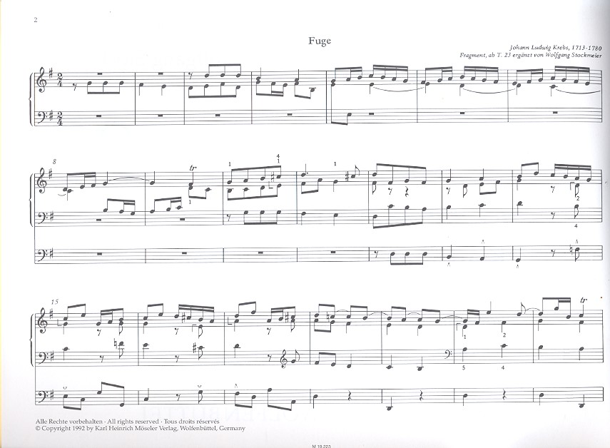 Stockmeier, Wolfgang, ed Orgelmusik der Klassik und Romantik Band 23 Präludium a-Moll (Julius André) Fuga C-Dur (Andreas Bibl) Präludium c-Moll (Moritz Brosig) Präludium und Fughette C-Dur (Carl Czerny) Tanz der Glückseligen aus op.56 (Zdenek Fibich) Andante g-Moll (Christian Fink) 2 Orgelstücke a-Moll aus op.36 (Theophil Forchhammer) Adagio B-Dur (Christian Hamm) Invention c-Moll (Karl Hasse) Preludio pro organo pleno a-Moll (Joh. Chr. Kittel) Fuge C-Dur (Johann Ludwig Krebs) Fughetta F-Dur (Vinzenz Lachner) Zur Kommunion F-Dur (Nicolas Lemmens) Ostinato c-Moll (Mendelssohn) Fuge d-Moll (Mozart) Adagio non troppo f-Moll (Gabriel Josef Rheinberger) 5 Präludien in C, a, E, d, b (J.C.H. Rinck)