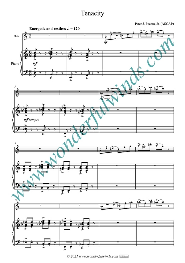 Tenacity for Flute and Piano is a musical representation of the perseverance, persistence, and determination needed to reach a goal, complete a task, etc. Tenacity features driving rhythms, unsettled harmonies and a lively dialogue between the flute and the piano that propel the music to its conclusion. The piece is a great workout for articulation and also gives an opportunity to work on register skips to develop flexibility and evenness of tone.