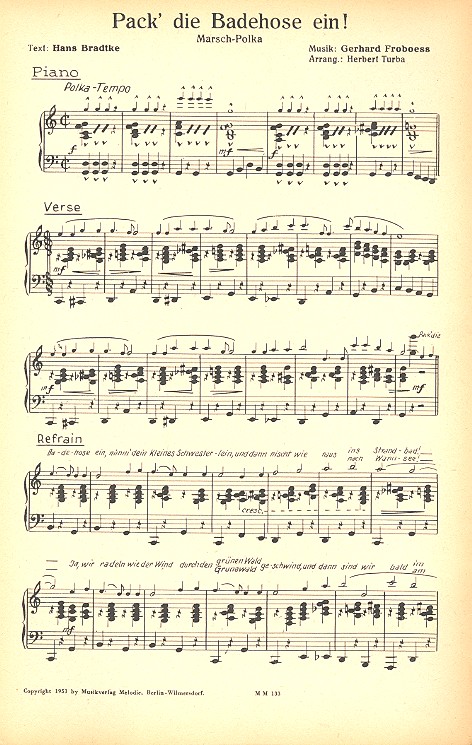 Pack die Badehose ein Froboess, Gerhard, Musik Bradtke, Hans, Text Turba, Herbert, arr. O Donna Juanita Lehn, Erwin, Musik Blecher, Carl-Ulrich, Text Gardens, Helmut, arr.