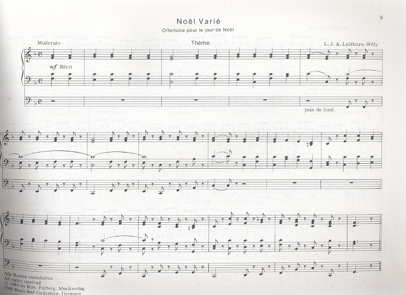 Lüders, Kurt, ed Les maitres parisiens de l'orgue au 19ème siècle Boellmann, Leon Offertoire sur des noels Boely, Alexandre Pierre Francois Chauvet, Alexis Deux offertoires sur des noels Franck, César Offertoire sur un noel bréton Guilmant, Alexandre Offertoire sur des noels Lefebure-Wely, Louis James Alfred Noel varié Loret, Clément Fantaisie pastorale