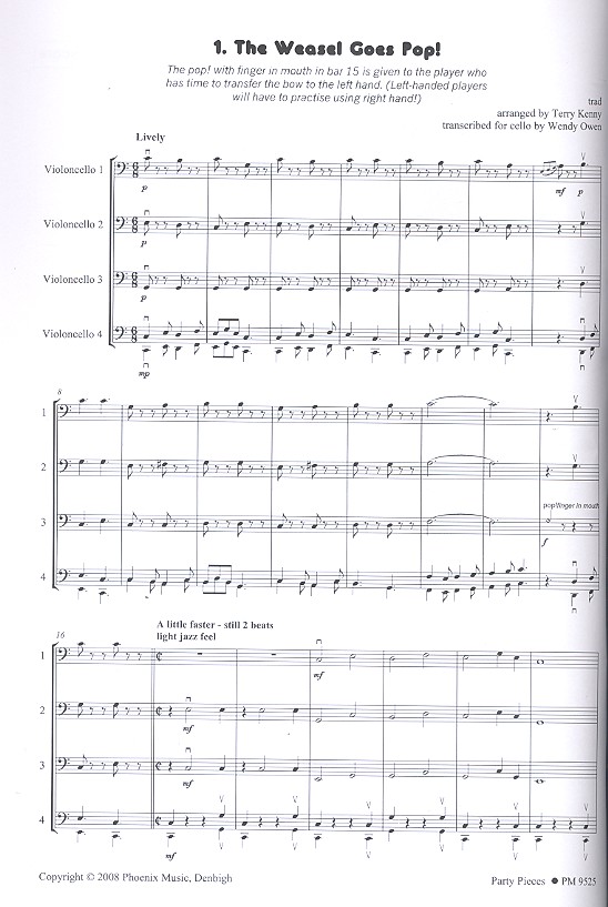 Easy Cellos together Kenny, Terry, arr. Cathrine, Terry, arr. Owen, Wendy, transc. 10 Arranfements The Weasel goes Pop Chopsticks The Hootchy Kootchy Dance If You're happy Old MacDonald Cursory Rhymes Little brown Jug Salsa Rock-a-bye Baby Polly put the Booze away There's a Hole in my Bucket