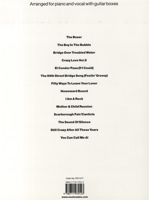 The Boxer The Boy in the Bubble Bridge over troubled Water Crazy Love vol.2 El condor pasa (if I could) If I could The 59th Street Bridge Song (feelin' groovy) Feelin' groovy Fifty Ways to leave your Lover Homeward bound I am a Rock Mother & Child Reunion Scarborough Fair / Canticle Canticle The Sound of Silence Still crazy after all these Years You can call me Al