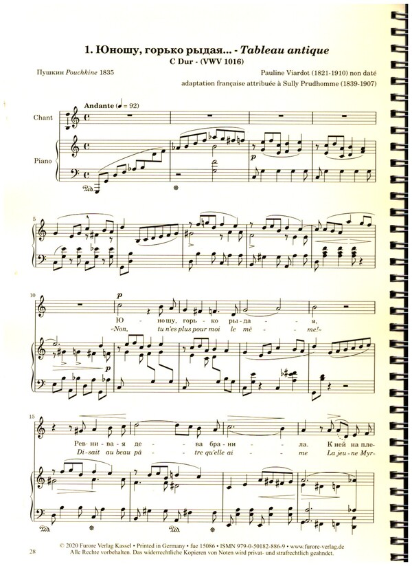 Pierre, Marc, ed 16 Lieder auf Gedichte von Pusckin mit Unterstützung von Marie-Hélène Pierre, Bachelor of Musicology der Universität Paris IV-Sorbonne, Nataliya Schinkewitsch, Übersetzerin, und Laurent Martin, Pianist Pauline Viardot singt Puschkin: Die Ausgabe der 16 Lieder von Pauline Viardot auf Gedichte von Alexander Sergejewitsch Puschkin ist das Ergebnis einer internationalen Zusammenarbeit. Im Jahr 2018 kam der Pariser Herausgeber Marc Pierre mit der Idee zum Furore Verlag, anlässlich des 200. Geburtstags der Komponistin 2021 diese Liedsammlung zu veröffentlichen. Michelle Pauline Viardot-García, geb. García, (* 18. Juli 1821 in Paris, 18. Mai 1910 ebenda) war eine der berühmtesten und vielseitigsten Künstlerinnen des 19. Jahrhunderts. Sie hat in der zweiten Hälfte des 19. Jahrhunderts das Musikleben ihrer Zeit in verschiedenen Ländern, vor allem in Frankreich, Deutschland, England und Russland, wesentlich mitgeprägt. Sie sang, komponierte und unterrichtete, sie bearbeitete und edierte Werke anderer Komponisten, sammelte Volksliedtexte und -melodien, veranstaltete musikalische Salons und führte zudem eine umfangreiche Korrespondenz. In dieser Sammlung sind nun zum ersten Mal in französischer und russischer Fassung die 16 Lieder von Pauline Viardot zusammengefasst, denen sie Gedichte von Alexander Sergejewitsch Puschkin (1799-1837) zugrunde gelegt hat. Diese Melodien sind ein bemerkenswertes Beispiel für die reiche kulturelle Zusammenarbeit zwischen Russland, Frankreich und Deutschland. Puschkins Gedichte waren in Russland wegen ihrer Kürze, ihres Rhythmus und ihrer Harmonie sehr geschätzt. Turgenjew, der die Werke des großen Dichters sehr gut kannte, las im Salon der Viardots in der Nähe von Paris seine Werke vor. Sicher war er es, der Pauline vorschlug, sie in der Originalsprache zu vertonen. Diese Sammlung von vollständig zweisprachigen russisch-französischen Partituren, vereint verschiedene Quellen, deren Manuskripte und Stiche mehr als hundert Jahre zurückreichen. Unter diesen Kompositionen sind vier Erstveröffentlichungen. Es freut uns, dass mit Unterstützung des Kulturfonds der VG Musikedition diese Liedsammlung nun publiziert werden kann. Die Dokumente wurden gesammelt, angepasstund ins Russische übersetzt von Marie-Hélène Pierre, Bachelor of Musicology der Universität Paris IV-Sorbonne, Nataliya Schinkewitsch, Übersetzerin und dem Pianisten Laurent Martin. Die deutsche Übersetzung hat Ingrid Mayer übernommen. Tableau antique (VWV1016) Fleur desséchée (VWV1018) Les ténèbres couvrent les monts (VWVé1037) Invocation (VWV1041) La nuit (VWV1056) Le captif (VWV1057) L'oiseau de Dieu (VWV1058) Insomnie (VWV1061) Pour retourner dans ta patrie (VWV1064) Géorgienne (VWV1066) L'orage (VWV1069) È, Vénus immortelle (VWV1114) Romance espagnole (VWV1115) Chanson écossaise (VWV1117) Vieux mari, dur, aigri (VWV1138) Le nuage (VWV1186)
