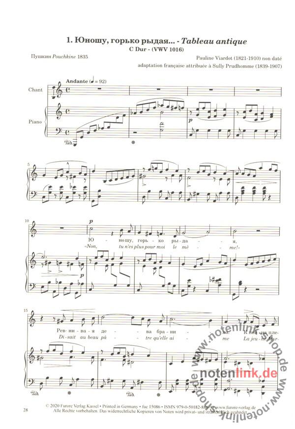 Pierre, Marc, ed 16 Lieder auf Gedichte von Pusckin mit Unterstützung von Marie-Hélène Pierre, Bachelor of Musicology der Universität Paris IV-Sorbonne, Nataliya Schinkewitsch, Übersetzerin, und Laurent Martin, Pianist Pauline Viardot singt Puschkin: Die Ausgabe der 16 Lieder von Pauline Viardot auf Gedichte von Alexander Sergejewitsch Puschkin ist das Ergebnis einer internationalen Zusammenarbeit. Im Jahr 2018 kam der Pariser Herausgeber Marc Pierre mit der Idee zum Furore Verlag, anlässlich des 200. Geburtstags der Komponistin 2021 diese Liedsammlung zu veröffentlichen. Michelle Pauline Viardot-García, geb. García, (* 18. Juli 1821 in Paris, 18. Mai 1910 ebenda) war eine der berühmtesten und vielseitigsten Künstlerinnen des 19. Jahrhunderts. Sie hat in der zweiten Hälfte des 19. Jahrhunderts das Musikleben ihrer Zeit in verschiedenen Ländern, vor allem in Frankreich, Deutschland, England und Russland, wesentlich mitgeprägt. Sie sang, komponierte und unterrichtete, sie bearbeitete und edierte Werke anderer Komponisten, sammelte Volksliedtexte und -melodien, veranstaltete musikalische Salons und führte zudem eine umfangreiche Korrespondenz. In dieser Sammlung sind nun zum ersten Mal in französischer und russischer Fassung die 16 Lieder von Pauline Viardot zusammengefasst, denen sie Gedichte von Alexander Sergejewitsch Puschkin (1799-1837) zugrunde gelegt hat. Diese Melodien sind ein bemerkenswertes Beispiel für die reiche kulturelle Zusammenarbeit zwischen Russland, Frankreich und Deutschland. Puschkins Gedichte waren in Russland wegen ihrer Kürze, ihres Rhythmus und ihrer Harmonie sehr geschätzt. Turgenjew, der die Werke des großen Dichters sehr gut kannte, las im Salon der Viardots in der Nähe von Paris seine Werke vor. Sicher war er es, der Pauline vorschlug, sie in der Originalsprache zu vertonen. Diese Sammlung von vollständig zweisprachigen russisch-französischen Partituren, vereint verschiedene Quellen, deren Manuskripte und Stiche mehr als hundert Jahre zurückreichen. Unter diesen Kompositionen sind vier Erstveröffentlichungen. Es freut uns, dass mit Unterstützung des Kulturfonds der VG Musikedition diese Liedsammlung nun publiziert werden kann. Die Dokumente wurden gesammelt, angepasstund ins Russische übersetzt von Marie-Hélène Pierre, Bachelor of Musicology der Universität Paris IV-Sorbonne, Nataliya Schinkewitsch, Übersetzerin und dem Pianisten Laurent Martin. Die deutsche Übersetzung hat Ingrid Mayer übernommen. Tableau antique (VWV1016) Fleur desséchée (VWV1018) Les ténèbres couvrent les monts (VWVé1037) Invocation (VWV1041) La nuit (VWV1056) Le captif (VWV1057) L'oiseau de Dieu (VWV1058) Insomnie (VWV1061) Pour retourner dans ta patrie (VWV1064) Géorgienne (VWV1066) L'orage (VWV1069) È, Vénus immortelle (VWV1114) Romance espagnole (VWV1115) Chanson écossaise (VWV1117) Vieux mari, dur, aigri (VWV1138) Le nuage (VWV1186)