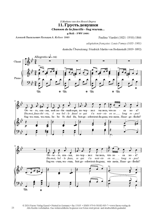 Sag warum Heißer glühte mein Herz Die Weide Der Wachmann Licht und Schatten Die Meise In der Frühe Der Schlüssel zum Rätsel Trennung Herausgegeben von Marc Pierre mit Unterstützung von Marie-Hélène Pierre, Bachelor of Musicology der Universität Paris IV-Sorbonne, Nataliya Schinkewitsch, Übersetzerin, und Laurent Martin, Pianist Pauline Viardot singt Puschkin: Die Ausgabe der 16 Lieder von Pauline Viardot auf Gedichte von Alexander Sergejewitsch Puschkin ist das Ergebnis einer internationalen Zusammenarbeit. Im Jahr 2018 kam der Pariser Herausgeber Marc Pierre mit der Idee zum Furore Verlag, anlässlich des 200. Geburtstags der Komponistin 2021 diese Liedsammlung zu veröffentlichen. Michelle Pauline Viardot-García, geb. García, (* 18. Juli 1821 in Paris, 18. Mai 1910 ebenda) war eine der berühmtesten und vielseitigsten Künstlerinnen des 19. Jahrhunderts. Sie hat in der zweiten Hälfte des 19. Jahrhunderts das Musikleben ihrer Zeit in verschiedenen Ländern, vor allem in Frankreich, Deutschland, England und Russland, wesentlich mitgeprägt. Sie sang, komponierte und unterrichtete, sie bearbeitete und edierte Werke anderer Komponisten, sammelte Volksliedtexte und -melodien, veranstaltete musikalische Salons und führte zudem eine umfangreiche Korrespondenz. In dieser Sammlung sind nun zum ersten Mal in französischer und russischer Fassung die 16 Lieder von Pauline Viardot zusammengefasst, denen sie Gedichte von Alexander Sergejewitsch Puschkin (17991837) zugrunde gelegt hat. Diese Melodien sind ein bemerkenswertes Beispiel für die reiche kulturelle Zusammenarbeit zwischen Russland, Frankreich und Deutschland. Puschkins Gedichte waren in Russland wegen ihrer Kürze, ihres Rhythmus und ihrer Harmonie sehr geschätzt. Turgenjew, der die Werke des großen Dichters sehr gut kannte, las im Salon der Viardots in der Nähe von Paris seine Werke vor. Sicher war er es, der Pauline vorschlug, sie in der Originalsprache zu vertonen. Diese Sammlung von vollständig zweisprachigen russisch-französischen Partituren, vereint verschiedene Quellen, deren Manuskripte und Stiche mehr als hundert Jahre zurückreichen. Unter diesen Kompositionen sind vier Erstveröffentlichungen. Es freut uns, dass mit Unterstützung des Kulturfonds der VG Musikedition diese Liedsammlung nun publiziert werden kann. Die Dokumente wurden gesammelt, angepasst und ins Russische übersetzt von Marie-Hélène Pierre, Bachelor of Musicology der Universität Paris IV-Sorbonne, Nataliya Schinkewitsch, Übersetzerin und dem Pianisten Laurent Martin. Die deutsche Übersetzung hat Ingrid Mayer übernommen.
