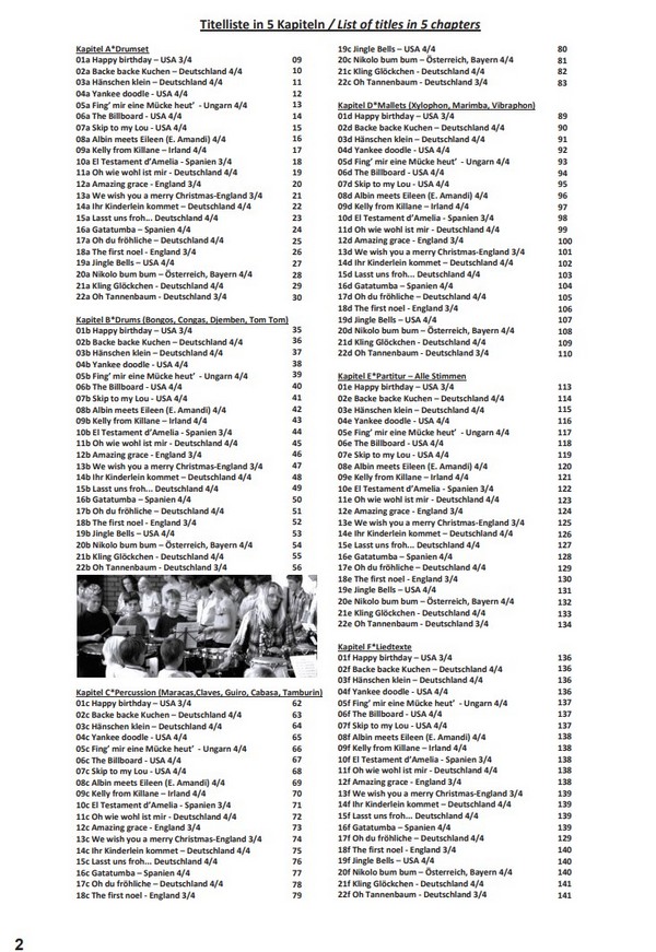 Playalongs für Duo, Trio, Quartett mit 22 Songs und mp3-download Elisabeth Amandi hilft Anfängern vom Kind ab 6 bis zum Erwachsenen, das Musizieren mit Percussioninstrumenten in einer Gruppe zu lernen. Die einfachen Rhythmen von den Trommeln bzw. Klein-Percussion sind fur den Einstieg ideal. Die Melodien können auch von einem Chor gesungen (Texte im Buch) oder auf anderen Melodieinstrumenten gespielt und dazu rhythmisch am Drumset, Trommeln oder Klein-Percussion begleitet werden. Alle Lieder können mit der mp3-Audiodatei alleine oder auch bei einem Konzert oder Wettbewerb im Percussion-Team gespielt werden. 144 Seiten plus mp3-download von 22 Songs in in 2-5 Tempi per QR-Code im Buch.