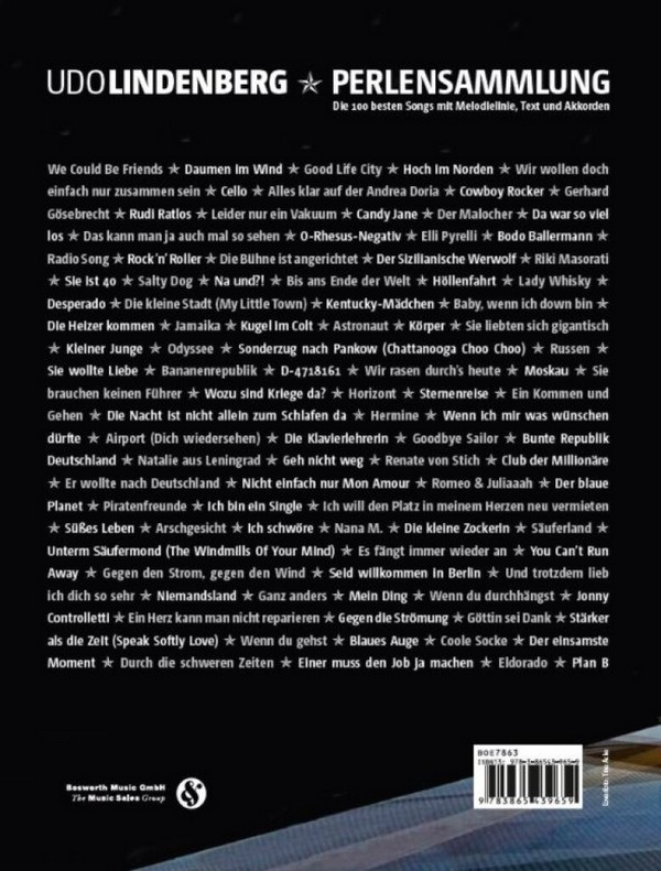 Die als aufwendiges Hardcover gestaltete Perlensammlung zollt dem Panik-Rocker Udo Lindenberg gebührenden Tribut. Das Songbook umfasst auf mehr als 400 Seiten 100 Hits aus Lindenbergs breit gefächertem Werk, alle Schaffensperioden sind dabei abgedeckt. Neben den Liedern enthält das Buch viele zum Teil noch unveröffentlichte Fotos und umfangreiches Zusatzmaterial aus dem Udo Lindenberg Archiv in Berlin sowie ein exklusives Vorwort von Udo. Der seit Ende der 1960er Jahre mit zunehmendem Erfolg aktive Multiinstrumentalist, Komponist und Sänger begann zunächst als Schlagzeuger und brachte dann mit eigenen Texten und Gesang die deutschsprachigeRockmusik einem breiteren Publikum näher. Udo erreichte mit seinem 34. Studioalbum Stark wie Zwei im Jahr 2008 im Alter von 62 Jahren zum ersten Mal in seiner Karriere auch Platz eins der deutschen Charts. Im Songbook findet sich das absolut Beste seiner Studioeinspielungen, Livealben, Kompilationen und EPs. All-Time-Hits wie Alles klar auf der Andrea Doria, Cello, Sonderzug nach Pankow, Ein Herz kann man nicht reparieren, Horizont, Mein Ding oder Rudi Ratlos stehen neben eher unbekannteren Perlen wie Odyssee, Einer muss den Job ja machen oder Club der Millionäre. Die 100 besten Songs We could be Friends Daumen im Wind Good Life City Hoch im Norden Wir wollen doch einfach nur zusammen sein Cello Alles klar auf der Andrea Doria Cowboy Rocker Gerhard Gösebrecht Rudi Ratlos Leider nur ein Vakuum Candy Jane Der Malocher Da war so viel los Das kann man ja auch mal so sehen 0-Rhesus-Negativ Elli Pyrelli Bodo Ballermann Radio Song Rock'n'Roller Die Bühne ist angerichtet Der sizilianische Werwolf Riki Masorati Sie ist 40 Salty Dog Na und Bis ans Ende der Welt Höllenfahrt Lady Whisky Desperado Die kleine Stadt (My little Town) Kentucky-Mädchen Baby wenn ich down bin Die Heizer kommen Jamaika Kugel im Colt Astronaut Körper Sie liebten sich gigantisch Kleiner Junge Odysee Sonderzug nach Pankow Russen Sie wollte Liebe Bananenrepublik D-4718161 Wir rasen durchs heute Moskau Sie brauchen keinen Führer Wozu sind Kriege da Horizont Sternenreise Ein Kommen und Gehen Die Nacht ist nicht allein zum Schlafen da Hermine Wenn ich mir was wünschen dürfte Airport (Dich wiedersehen) Die Klavierlehrerin Goodbye Sailor Bunte Republik Deutschland Natalie aus Leningrad Geh nicht weg Renate von Stich Club der Millionäre Er wollte nach Deutschland Nicht einfach nur Mon amour Romeo & Juliaaah Der blaue Planet Piratenfreunde Ich bin ein Single Ich will den Platz in meinem Herzen neu vermieten Süßes Leben Arschgesicht Ich schwöre Nana M. Die kleine Zockerin Säuferland Unterm Säufermond Es fängt immer wieder an You can't run away Gegen den Strom gegen den Wind Seid willkommen in Berlin Und trotzdem lieb ich dich so sehr Niemandsland Ganz anders Mein Ding Wenn du durchhängst Jonny Controlletti Ein Herz kann man nicht reparieren Gegen die Strömung Göttin sei Dank Stärker als die Zeit Wenn du gehst Blaues Auge Coole Socke Der einsamste Moment Durch die schweren Zeiten Einer muss den Job ja machen Eldorado Plan B