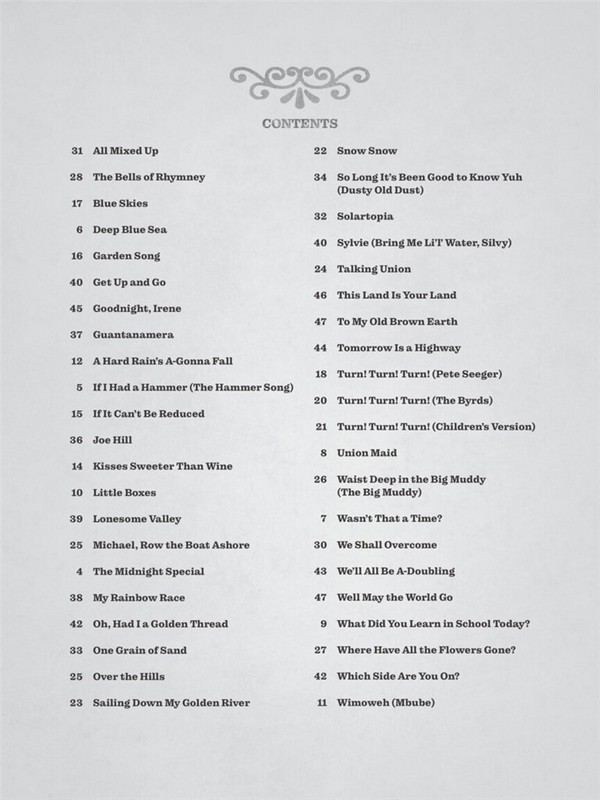 All Mixed Up The Bells Of Rhymney Blue Skies Bring Me Li'l' Water, Silvy Deep Blue Sea Garden Song Get Up And Go Goodnight, Irene Guantanamera A Hard Rain's A-Gonna Fall If I Had A Hammer (The Hammer Song) If It Can't Be Reduced Joe Hill Kisses Sweeter Than Wine Little Boxes Lonesome Valley Mbube (Wimoweh) Michael Row The Boat Ashore Midnight Special My Rainbow Race Oh, Had I A Golden Thread One Grain Of Sand Over The Hills Sailing Down My Golden River Snow, Snow So Long It's Been Good To Know Yuh (Dusty Old Dust) Solartopia Talking Union This Land Is Your Land To My Old Brown Earth Tomorrow Is A Highway Turn! Turn! Turn! (To Everything There Is A Season) Union Maid Waist Deep In The Big Muddy (The Big Muddy) Wasn't That A Time We Shall Overcome We'll All Be Doubling Well May The World Go What Did You Learn In School Today? Where Have All The Flowers Gone? Which Side Are You On