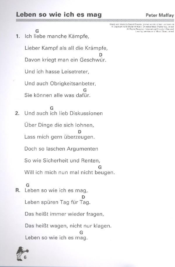 Leben so wie ich es mag Tulsa time Mull of Kintyre Get back Follow me Another brick in the wall Heart of Gold Die freiheit Johnny W. Save tonight San Francisco Love is all around Über den Wolken Imagine Wish you were here Leaving on a jet plane Hotel California Wieder hier Johnny B. Goode Stand by me Proud Mary Words Lola Nobody knows you Take me home country roads Nothing else matters Don't think twice it's all right Der Luftgitarren-Blues