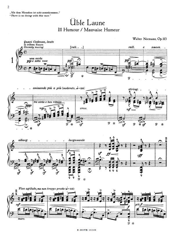 Klavierzyklus nach Worten von Wilhelm Hauff Üble Laune Regennacht / Rainy night / Nuit pluvieuse Bachhantenzug / Bacchus procession / La cortege de Bacchus Jungfer Roses Sarabande / Old Rose?s Saraband / Sarabende de Mlle. Rose Roland der Riese / Roland the giant / Roland, le colosse Altes Lied / Old song / Vieille romance Die zwölf Apostel / The twelve apostles / Les douze apotres Wie der Teufel den alten Kellermeister holt / How the devil takes the old cellarer / Comment le diable emporte le vieux cellelier Der Morgen / The morning / Le matin