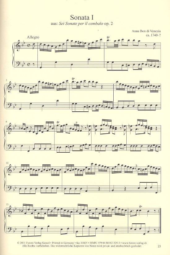 Furore 25 Jubiläumsband 2 Women Composers through the Centuries mit umfangreichem Vorwort, Biografien und Werknotizen 17 Klavierstücke von Komponistinnen aus zehn Ländern: Anna Bon di Venezia (ca.1740-'): Sonata I, 1. Satz Allegro, aus: Sei Sonate per il cembalo op. 2 Maria Hester Park (1760-1813): Sonata I, 1. Satz Allegro, aus: Two Sonatas for the Pianoforte or Harpsichord op. 4 Maria Szymanowska (1789-1831): Contre-danse, aus: Dix-huit Danses de différent genre pour le Pianoforte Emilie Zumsteeg (1796-1857): Polonaise Nr. 3, aus: Trois Polonaises pour le Pianoforte Louise Farrenc (1804-1875): Nocturne op. 49/1 Mel Bonis (1858-1937): Prélude op. 10, aus: Cinq pièces musicales Fanny Hensel geb. Mendelssohn (1805-1847): Klavierstück, E-Dur und Andante, d-Moll (Erstveröffentlichung) Cécile Chaminade (1857-1944): Marche Russe, aus: Album des Enfants op. 123/12 Ruth Schonthal (1924-2006): The Seagull's slow Ascent and Descent, aus: Five Oceanic Preludes Ljubica Maric (1909-2003): Song and Dance Barbara Heller (*1936): Nelkenblume, aus: Klaviermusik Viera Janárceková (*1951): Tröpfelnde Elegie, aus: Abgestaubte Saiten Hope Lee (*1953): Flower Drum Dance Sibylle Pomorin (*1956): Nr. III aus: Istanbuler Kompositionen Florentine Mulsant (*1962): Nr. II und III aus: Cinq Pièces pour les enfants pour piano op. 12 Vivienne Olive (*1950): Bush Gin Rag