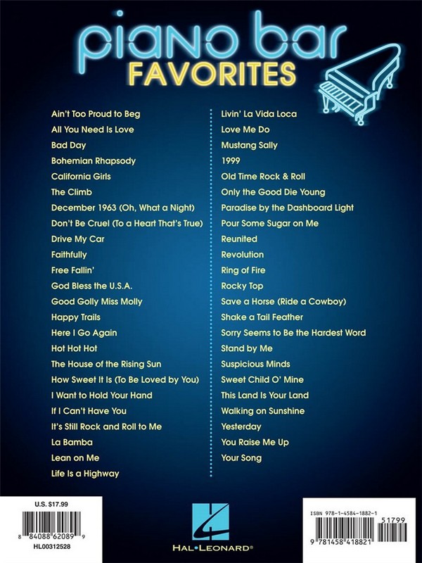 over 45 great Songs 1999 Ain't Too Proud To Beg All You Need Is Love Bad Day Bohemian Rhapsody California Girls December 1963 (Oh, What A Night) Don't Be Cruel (To A Heart That's True) Drive My Car Faithfully Free Fallin' God Bless The U.S.A. Good Golly Miss Molly Happy Trails Here I Go Again Hot Hot Hot How Sweet It Is (To Be Loved By You) I Want To Hold Your Hand If I Can't Have You It's Still Rock And Roll To Me La Bamba Lean On Me Life Is A Highway Livin' La Vida Loca Love Me Do Mustang Sally Old Time Rock & Roll Only The Good Die Young Paradise By The Dashboard Light Pour Some Sugar On Me Reunited Revolution Ring Of Fire Rocky Top Save A Horse (Ride A Cowboy) Shake A Tail Feather Sorry Seems To Be The Hardest Word Stand By Me Suspicious Minds Sweet Child O' Mine The Climb The House Of The Rising Sun This Land Is Your Land Walking On Sunshine Yesterday You Raise Me Up Your Song