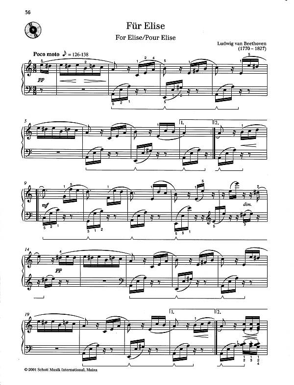 Germer, Karin, ed Beliebte Stücke von Bach bis Satie Praeludium C-Dur (BWV 846) (Bach) Praeludium c-Moll (BWV 999) (Bach) Le Coucou (Rondeau) (Daquin) Solfeggietto (CPE Bach) Sonata facile (KV 545) (Mozart) Bagatelle, op. 119/1 (Beethoven) Für Elise (Beethoven) Sonate cis-Moll, op. 27,2 (Beethoven) Erster Verlust, op. 68/16 (Schumann) Träumerei (Schumann) Ballade, op. 100/15 (Burgmüller) Walzer, op. 18 (Schubert) Ein Träne, op. posth. No. 18 (Mussorgski) Süße Träumerei, op. 39/21 (Tschaikowsky) Norwegisch, op. 12/6 (Grieg) Prélude Des-Dur, op. 28/15 (Chopin) Der kleine Neger (Debussy) Gymnopédie No. 1 (Satie)