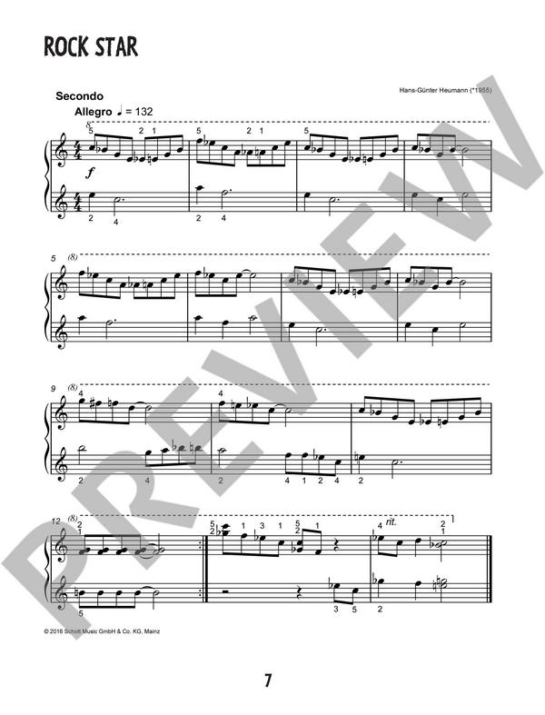 Heumann, Hans-Günter, arr. Die richtigen Stücke für das erste Konzert Tanz op.179,2 (C. Gurlitt) Rock Star (H.-G. Heumann) Der tanzende Troll (H.-G. Heumann) Michael, Row the Boat Ashore (Spiritual, Arr.) Kum ba yah (Geistliches Lied aus Amerika, Arr.) Kleine Polka op.39,2 (D. Kabalewski) Menuett (W. Duncombe) Ballade pour Adeline (P. de Senneville, Arr.) Weißt du, wie viel Sternlein stehen (Volkstümlich W. Hey, Arr.) Gavotte II-Musette (J. S. Bach, Arr.) The Entertainer (S. Joplin, Arr.) Running Fingers (H.-G. Heumann) Piano Moods (H.-G. Heumann) Türkischer Marsch (L. van Beethoven, Arr.) Worried Man Blues (Volkslied aus Amerika, Arr.) Ländler Nr.3 aus KV 606 (W. A. Mozart, Arr.) Bella Bimba (Volkslied aus Italien, Arr.) Prélude (M.-A. Charpentier, Arr.) Horch, was kommt von draußen rein (Volkslied aus Deutschland) Baby Elephant Walk aus dem Film "Hatari" (H. Mancini, Arr.) Schöne Minka (Volkslied aus der Ukraine C.A. Tiedge, Arr.) Air russe op.107,7 (L. van Beethoven, Arr.) Ungarischer Tanz Nr.5 (J. Brahms, Arr.) Übungsstück op.190,34 (C. L. H. Köhler) Le Rêve (Traditional, Arr.) -Stompin' Rex Boogie (H.-G. Heumann) Spiel am Morgen (D. G. Türk) Ländlertanz (D. G. Türk) Tumbalalaika (Jiddisches Volkslied, Arr.) Tarantella (G. F. Humbert)