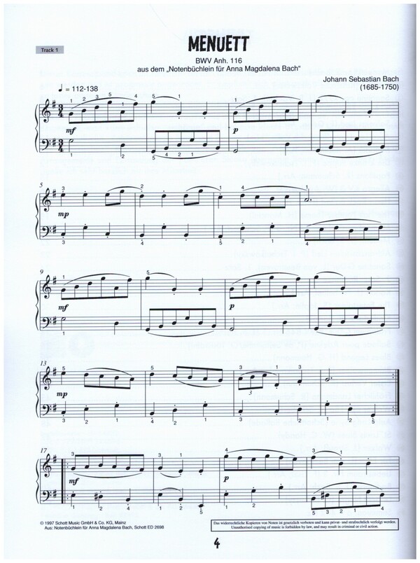 Vorspielstücke die Spaß machen J.S. Bach: Menuett aus dem 'Notenbüchlein für Anna Magdalena Bach' (BWV Anh. 116) Kalinka (Russische Volksweise) J.B. Vanhal: Sonatine, op. 41/2 E. Grieg: Solveigs Lied aus 'Peer Gynt-Suite', op. 55/2 Aura Lee (Elvis Presley/Amerikanische Volksweise) A. Rubinstein: Melodie, Thema aus op. 3/1 P.I. Tschaikowsky: Die kranke Puppe, op. 39/6 R. Schumann: Papillons, aus op. 2/1 W.A. Mozart: Allegro (KV 3) H.-G. Heumann: Heart Rock Ballad H. Mancini: The Pink Panther Theme aus dem Film 'The Return of the Pink Panther' F. Schubert: Moment Musical, op. 94/3 J.S. Bach: Menuett (BWV Anh. 115) P.I. Tschaikowsky: Altfranzösisches Lied, op. 39/16 L.v. Beethoven, Sonatine J. Pachelbel: Kanon für Streicher und B.c. S. Joplin: The Entertainer aus dem Film 'Der Clou' B. Bartók: Kindertanz (Gyermektánc) J.S. Bach: Präludium aus dem 'Wohltemperierten Klavier', Band 1 (BWV 846, Nr. 1 C-Dur) P.d. Senneville / O. Toussaint: Ballade pour Adeline (Richard Clayderman) H.-G. Heumann: Blues Legend P.I. Tschaikowsky: Blumenwalzer aus dem Ballett 'Der Nußknacker', op. 71 R. Schumann: Erster Verlust, op. 68/16 R. Schumann: Fröhlicher Landmann von der Arbeit zurückkehrend, op. 68/10 F. Schubert: Walzer aus op. 18 Auld Lang Syne (Joan Baez/Schottische Ballade) W.C. Handy: St. Louis Blues (Louis Armstrong/Glenn Miller) J. Strauß, Sohn: Walzer aus 'Die Fledermaus', op. 367 L.v. Beethoven: Für Elise F. Liszt: Liebestraum, Notturno Nr. 3 J.S. Bach: Badinerie aus der Orchester-Suite Nr. 2 h-Moll (BWV 1067) C. Debussy: Le Petit Nègre (Cake Walk)