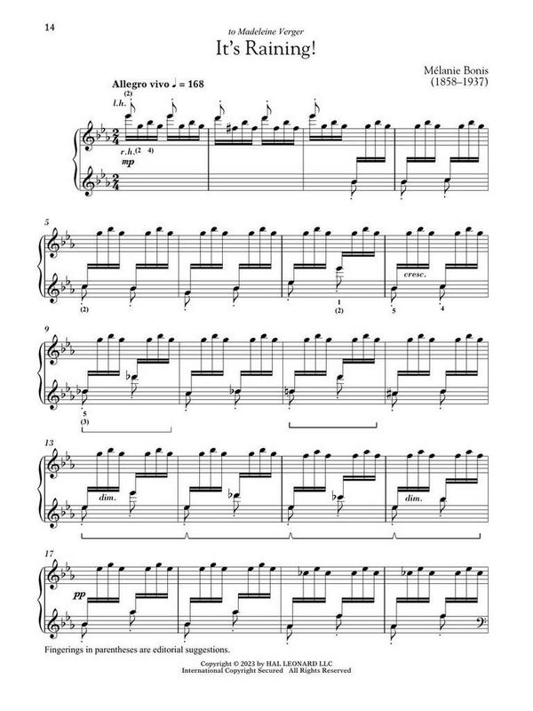 1. Grand Spanish Waltz in A Major [Mélanie Bonis] 2. It's Raining! [Mélanie Bonis] 3. Little Waltz in B-flat Major from Children's Album (Volume 2), Op. 126, No. 12 [Cécile Chaminade] 4. Melancholy from Two Pieces, 25, No. 1 [Cécile Chaminade] 5. Song Without Words in E-flat Major from Six Songs Without Words for Piano [Frederikke Egeberg] 6. Etude in F Major from 25 Intermediate Studies, Op. 42, No. 5 [Louise Farrenc] 7. Etude in G Major from 12 Studies in Dexterity, Op. 41, No. 2 [Louise Farrenc] 8. Melody in A-flat Major [Louise Farrenc] 9. Piano Piece in A-flat Major from Piano Pieces, Op. Posthumous, No. 4 [Emma Hartmann] 10. Summer Song MARIE JAËLL: Friendly Teasing from The Good Days [Cécile Hartog] 11. The Shepherd and the Echo from The Good Days [Cécile Hartog] 12. Whispers of the Forests from The Good Days [Cécile Hartog] 13. Edelweiss [Natalia Jonatha] 14. Homesickness from Three Piano Pieces [Josephine Lang] 15. Minuet: Sadness from Three Piano Pieces [Josephine Lang] 16. Mazurka in A minor MARIANNA MARTINES: Allegro from Sonata in A Major [Kate Loder] 17. Impromptu in A-flat Major, Op. 44 [Emilie Mayer] 18. Melody in E-flat Major from Six Melodies for the Piano, Op. 5, No. 6 [Fanny Mendelssohn] 19. Larghetto from Four Songs for the Piano, Op. 8, No. 3 No. 1 [Fanny Mendelssohn] 20. A Legend from Four Piano Pieces, Op. 9, [Adele Aus Der Ohe] 21. Sorry [Fanny Scholfield Petrie] 22. Song Without Words in E minor from Six Songs Without Words, Op. 18, No. 4 [Joy Delphine Von Schauroth] 23. Romance in A minor, WoO 28 (1892 version) [Clara Schumann] 24. Austrian Dance in A-flat Major from The People of Kapfenberg, Op. 67, No. 5 [Anna Stubenberg] 25. Polonaise in E minor from 18 Dances in Different Genres for Piano [Marie Szymanowska] 26. Quadrille in F Major from 18 Dances in Different Genres for Piano [Marie Szymanowska] 27. Pensée musicale [Stephanie Vrabely]