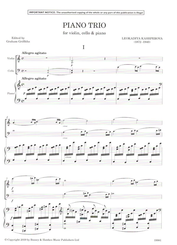 Kashperova Edition Griffiths, Graham, ed Leokadiya Kashperova (1872-1940), die als die Klavierlehrerin von Igor Strawinsky bislang nur als eine Randfigur in die Musikgeschichte eingegangen ist, erfreut sich jüngst einer großen Wiederentdeckung. Mit gleich zwei Abschlüssen am St. Petersburger Konservatorium ausgestattet, trat sie als virtuose Pianistin und der romantischen Tradition verpflichteten Komponistin in Erscheinung. Sie stand einigen der größten Musiker ihrer Zeit nahe, darunter Mily Alexejewitsch Balakirew und Leopold von Auer. Sie konzertierte in den 1900er-Jahren sowohl in Deutschland als auch in Großbritannien, aber ihre Karriere ebbte nach den 1920er-Jahren ab. Das mit Bleistift geschriebene Manuskript des Klaviertrios a-Moll (komponiert ca. 1930-40) wurde erst 2019 im Musikmuseum Moskau (Russian National Museum of Music) entdeckt. Graham Griffiths hat das Werk in enger Zusammenarbeit mit Mitgliedern des Gould Piano Trio herausgegeben, die auch die Uraufführung des Stückes im Jahr 2020 gespielt haben. Das viersätzige Werk von 28 Minuten Länge schwelgt im romantischen Idiom. Die Ausgabe ist neben den Cello Sonaten 1 & 2 ein weiterer Beitrag in der Kashperova Edition. Auf Grundlage dieser nun vorliegenden beiden Neuausgaben von Kashperovas Cellosonaten Nr. 1 und 2 wurden bereits Aufführungen im Rundfunk ausgestrahlt und auf CD eingespielt. Weitere Neuausgaben ihrer Sinfonie und ihres bislang unveröffentlichten Klavierkonzertes sind ebenfalls kürzlich erschienen.