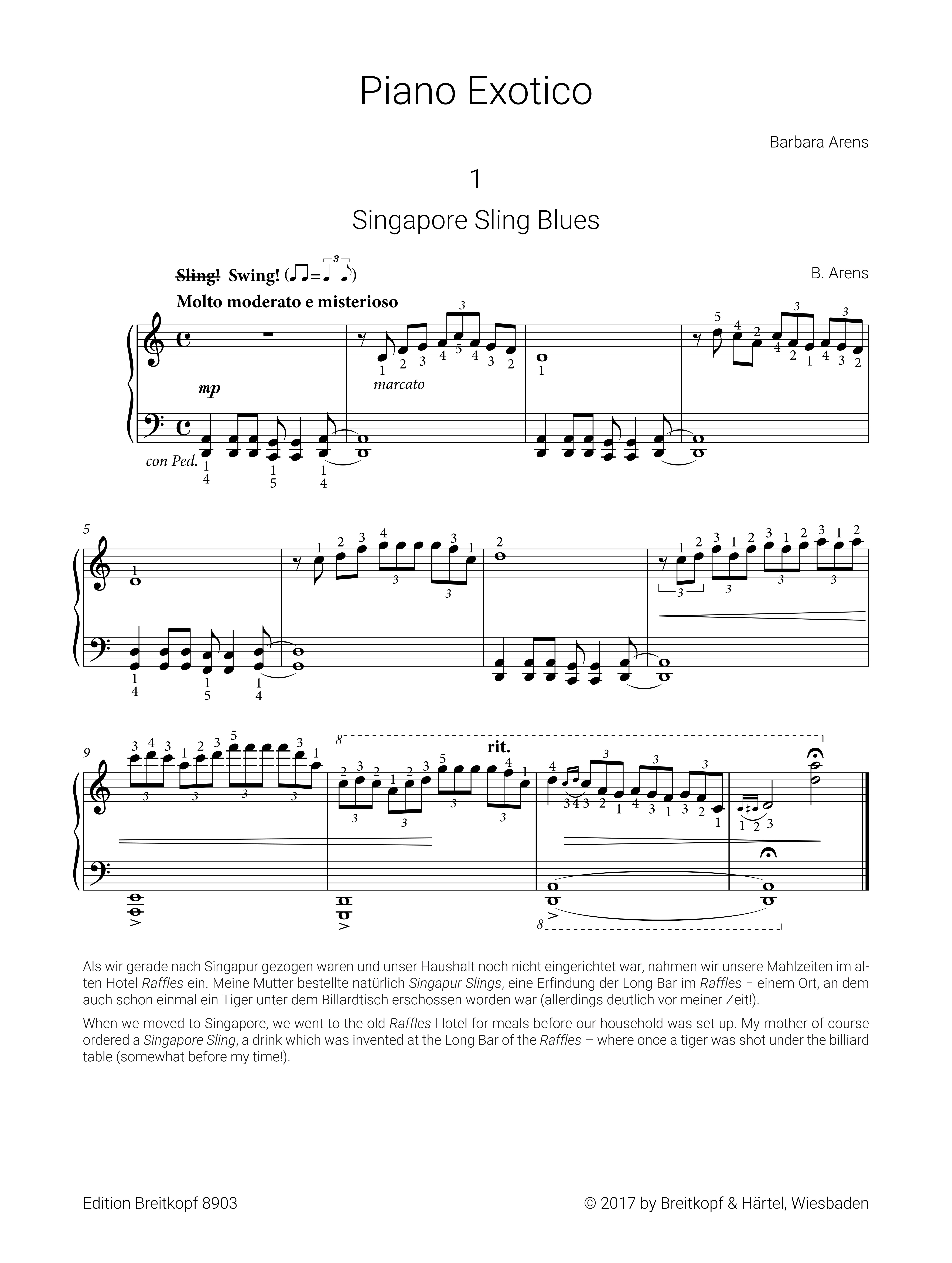 Barbara Arens, Autorin vieler bekannter Spielhefte für Klavier, hat das Fernweh gepackt. Gewohnt gekonnt und kreativ verwandelt sie die Sehnsucht nach fernsten Orten in 28 Klavierminiaturen. Die rhythmisch abwechslungsreichen Stücke von leicht bis mittelschwer entführen junge Pianisten ebenso wie erwachsene Wiedereinsteiger zu Fantasiereisen nach Indien, Jamaika, Singapur oder Orten entlang der Seidenstraße. Begegnungen mit Blues oder Reggae, Tango oder Klezmer bestärken unterwegs die Lust, weitere Stilrichtungen zu entdecken. Bis schließlich bei den wiederkehrenden Bewegungsmustern der Hawaiian Waterfalls die Endstation der fantasievollen Welttournee auf den schwarz-weißen Tasten erreicht ist. Fantastische Titel locken uns in exotische Welten, machen neugierig auf kultische Songs. ... kunstvoll eingebracht von einer mit offenen Ohren weitgereisten Musikpädagogin. (Eckart Rohlfs, neue musikzeitung) 28 Traumreisen Singapore Sling Blues Jungle Song Caligo Le tigre Sitar Evening Raga Sakura Beautiful Flower under the full Moon Geisha Chinatown Boogie Jaman Reggae A last Tango in Buenos Aires Klezmer Nigun Bollywood anyone Souvenir de Crete Balkan Gypsy Fandango El Escorial Robert's Rumba Aloha Rag On the Beach at Sunset Palms in the Wind Balinese Temple Dance Gauguin's Dream of Tahiti Dervishes' Dance Fado tràgico Sumatra Rain Caravanserei on the Silk Road Hawaiian Waterfalls