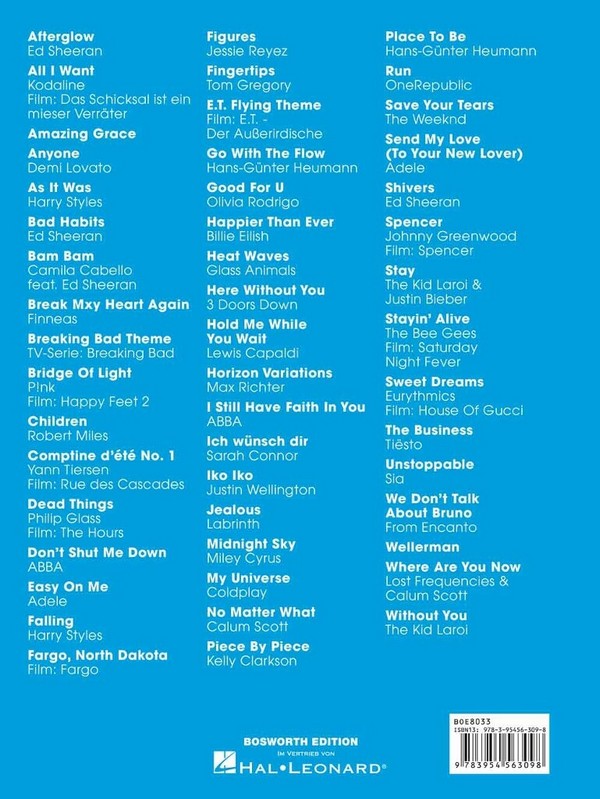 Von Camila Cabello bis Encanto Das ulitmative Spielbuch für Klavier leicht arrangiert 1. BAM BAM - Camila Cabello feat. Ed Sheeran 2. AFTERGLOW - Ed Sheeran 3. EASY ON ME - Adele 4. AS IT WAS - Harry Styles 5. HEAT WAVES - Glass Animals 6. HAPPIER THAN EVER - Billie Eilish 7. I STILL HAVE FAITH IN YOU - ABBA 8. HOLD ME WHILE YOU WAIT - Lewis Capaldi 9. ICH WÜNSCH DIR - Sarah Connor 10. GOOD 4 U - Olivia Rodrigo 11. STAY - The Kid Laroi & Justin Bieber 12. SAVE YOUR TEARS - The Weeknd 13. BAD HABITS - Ed Sheeran 14. MY UNIVERSE - Coldplay 15. WHERE ARE YOU NOW - Lost Frequencies & Calum Scott 16. WELLERMAN 17. SHIVERS - Ed Sheeran 18. BREAKING BAD MAIN THEME - Serie: Breaking Bad 19. FALLING - Harry Styles 20. SPENCER - Film: Spencer 21. MIDNIGHT SKY - Miley Cyrus 22. HORIZON VARIATIONS - Max Richter 23. E.T. FLYING THEME - Film: E.T. - Der Außerirdische 24. RUN - OneRepublic 25. ANYONE - Demi Lovato 26. BREAK MY HEART AGAIN - FINNEAS 27. THE BUSINESS - Tiësto 28. SEND MY LOVE (TO YOUR NEW LOVER) - Adele 29. DEAD THINGS - Film: The Hours 30. FINGERTIPS - Tom Gregory 31. GO WITH THE FLOW - Hans-Günter Heumann 32. BRIDGE OF LIGHT - P!nk / Film: Happy Feet 2 33. IKO IKO - Justin Wellington / The Dixie Cups 34. COMPTINE DÉTÉ NO. 1 - Film: Rue des Cascades 35. DONT SHUT ME DOWN - ABBA 36. FARGO, NORTH DAKOTA - Film: Fargo 37. HERE WITHOUT YOU - 3 Doors Down 38. PIECE BY PIECE - Kelly Clarkson 39. CHILDREN - Robert Miles 40. JEALOUS - Labrinth 41. WITHOUT YOU - The Kid Laroi 42. FIGURES - Jessie Reyez 43. PLACE TO BE - Hans-Günter Heumann 44. SWEET DREAMS (ARE MADE OF THIS) - Eurythmics / Film: House Of Gucci 45. UNSTOPPABLE - Sia 46. STAYIN ALIVE - The Bee Gees / Film: Saturday Night Fever 47. NO MATTER WHAT - Calum Scott 48. ALL I WANT - Kodaline / Film: Das Schicksal ist ein mieser Verräter 49. AMAZING GRACE - Judy Collins 50. WE DONT TALK ABOUT BRUNO - From Encanto