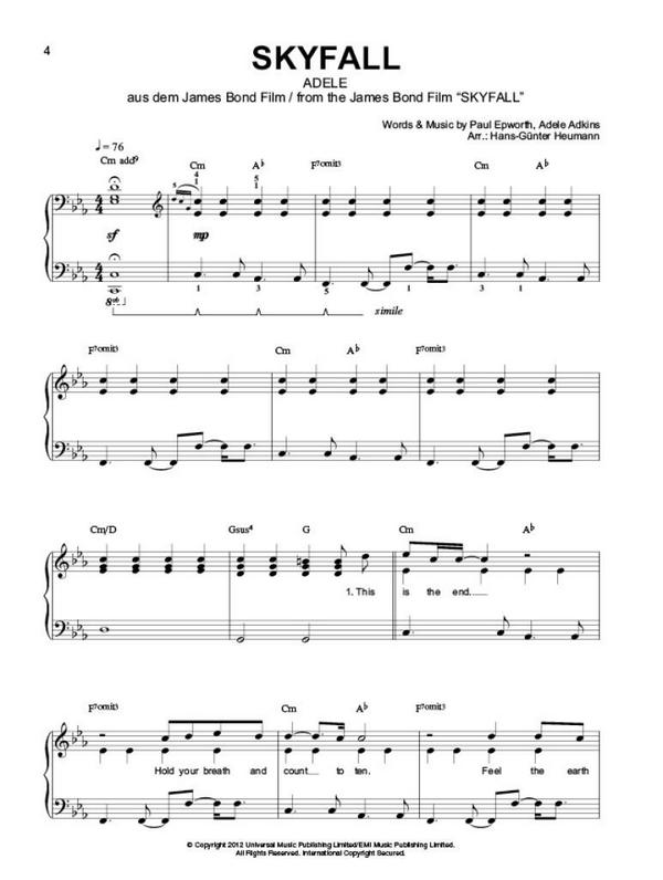 The second book in the Piano Gefallt Mir! series brings you 50 more chart and film hits, all arranged for easy piano by renowned composer Hans-Günter Heumann. spiral bound Heumann, Hans-Günter, arr. 50 Chart- und Film-Hits All Summer Long (Kid Rock) Almost Lover (Fine Frenzy, A) Balada (Lima, Gusttavo) Burn It Down (Linkin Park) Call Me Maybe (Jepsen, Carly Rae) Drive By (Train) Earth Song (Jackson, Michael) Easy (Commodores, The) Euphoria (Loreen) Fly Film (Ziemlich Beste Freunde) Geronimo (Dione, Aura) Grenade (Mars, Bruno) Hijo De La Luna (Loona) Hinterm Horizont Geht's Weiter (Lindenberg, Udo) Hung Up (Madonna) I Follow Rivers (Li, Lykke) I Guess That's Why They Call It The Blues (John, Elton) Ich Bereue Nichts (Silbermond) If I Ain't Got You (Keys, Alicia) Jar Of Hearts (Perri, Christina) Kiss The Rain (Yiruma) Küss Mich, Halt Mich, Lieb Mich Film (Drei Haselnüsse Für Aschenbrödel) Let It Be (Beatles, The) Mercy (Duffy) Music (Miles, John) Next To Me (Sandé, Emeli) November Rain (Guns N' Roses) Passion OF Love (Heumann, Hans-Gunter) Payphone (Maroon 5) (Wiz Khalifa) People Help The People (Birdy) Poker Face (Lady Gaga) Romantic Pop Prelude (Heumann, Hans-Günter) Skyfall (Adele) So Wie Du Warst (Unheilig) Standing Still (Lob, Roman) Summer Paradise (Simple Plan) (Paul, Sean) Summertime Sadness (Del Rey, Lana) Tage Wie Diese (Toten Hosen, Die) The Black Pearl (Pirates Of The Caribbean) The Climb (Hannah Montana) The Rose (Midler, Bette) The Scientist (Coldplay) Theme (Mission Impossible) Too Close (Clare, Alex) Turning Tables (Adele) Una Mattina (Ziemlich Beste Freunde) Unfaithful (Rihanna) Whistle (Flo Rida) Will You Still Love Me Tomorrow (King, Carole) (Winehouse, Amy) World In Our Hands (Cruz, Taio)