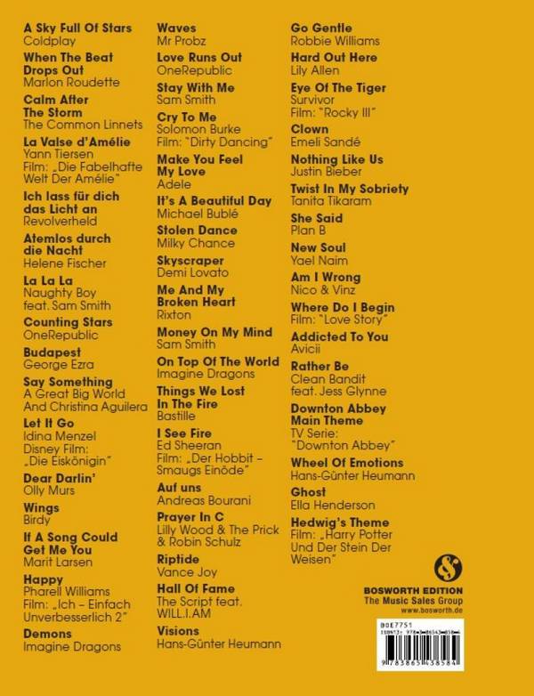 The fourth book in the Piano Gefällt Mir! series brings you 50 more chart and film hits, all arranged for Easy Piano by renowned composer Hans-Günter Heumann . This series has long been a favourite for Pianists looking to learn popular tracks from an authoritative source, and Hans-Günter Heumann has proven himself as a name you can rely on for Easy Piano arrangements of great modern pop classics. Everything from Coldplay to Harry Potter is included here, so you'll never be short of contemporary songs to learn and perform. From George Ezra's massive hi Budapest to Sam Smith's Money On My Mind , this book collects the finest hits from the past few years and arranges them for you to start playing straight away. A great selection of film songs and themes are also represented, such as Ed Sheeran's atmospheric I See Fire from 'The Hobbit' film, and Pharrell Williams's unbelievably catchy Happy from 'Despicable Me 2'. Not only this, but a few of Heumann 's own compositions are sprinkled throughout, allowing you to take inspiration from this indisputable giant of composition's own creations.This spiral-bound version is perfect for folding out or reading on your music stand, since the pages will stay exactly where they are. Heumann, Hans-Günter, arr. 50 Chart- und Film-Hits Von Coldplay bis Harry Potter 1. A Sky Full Of Stars [Coldplay] 2. When The Beat Drops Out [Rudette, Marlon] 3. Calm After The Storm [Common Linnets, The] 4. La Valse D'Amlie (From Amlie) [Tierson, Yann] 5. Ich Lass F?r Dich Das Licht An [Revolverheld] 6. Atemlos Durch Die Nacht [Fischer, Helene] 7. La La La [Naughty Boy] [Smith, Sam] 8. Counting Stars [OneRepublic] 9. Budapest [Ezra, George] 10. Say Something [A Great Big World feat. Aguilera, Christina] 11. Let It Go [Menzel, Idina] 12. Dear Darlin' [Murs, Olly] 13. Wings [Birdy] 14. If A Song Could Get Me You [Larsen, Marit] 15. Happy (Despicable Me 2) [Williams, Pharrell] 16. Demons [Imagine Dragons] 17. Waves [Mr Probz] 18. Love Runs Out (OneRepublic) 19. Stay With Me [Smith, Sam] 20. Cry To Me [Burke, Solomon] 21. Make You Fee My Love [Adele] 22. It's A Beautiful Day [Bubl, Michael] 23. Stolen Dance [Milky Chance] 24. Skyscraper [Lovato, Demi] 25. Me And My Broken Heart [Rixton] 26. Money On My Mind [Smith, Sam] 27. On Top Of The World [Imagine Dragons] 28. Things We Lost In The Fire [Bastille] 29. I See Fire (The Hobbit: The Desolation Of Smaug) [Sheeran, Ed] 30. Auf Uns [Bourani, Andreas] 31. Prayer In C [Wood, Lilly] 32. Riptide [Vance Joy] 33. Hall Of Fame [The Script] [Will.i.am] 34. Visions [Heumann, Hans-G?nter] 35. Go Gentle [Williams, Robbie] 36. Hard Out Here [Allen, Lily] 37. Eye Of The Tiger [Survivor] 38. Clown [Sand, Emeli] 39. Nothing Like Us [Bieber, Justin] 40. Twist In My Sobriety [Tikaram, Tanita] 41. She Said [Plan B] 42. New Soul [Naim, Yael] 43. Am I Wrong [Nico & Vinz] 44. Where Do I Begin (Love Story) [Lai, Francis] 45. Addicted To You [Avicii] 46. Rather Be [Clean Bandit feat. Glynne, Jess] 47. Downton Abbey (Theme) [Lunn, John] 48. Wheel Of Emotions [Heumann, Hans-G?nter] 49. Ghost [Henderson, Ella] 50. 'Hedwig's Theme (from ''Harry Potter and the Sorcerer's Stone'') [Williams, John]'