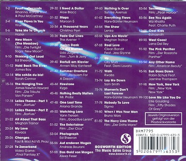 Heumann, Hans-Günter, arr. 50 Chart- und Film-Hits Von Rihanna bis Shades of Grey FourFiveSeconds (Rihanna) (West, Kanye) (McCartney, Paul) River Flows In You (Yiruma) Take Me To Church (Hozier) New Moon (The Meadow) From Twilight: New Moon Thinking Out Loud (Sheeran, Ed) Hold Back The River (Bay, James) Wie Schön Du Bist (Connor, Sarah) The Hanging Tree (Howard, James Newton) Leila's Theme Part 1 (From 'Barfuss') Leila's Theme Part 2 (From 'Barfuss') All About That Bass (Trainor, Meghan) My Love (Kovacs) Changes (Faul & Wad Ad Vs. Pnau) To Zanarkand (From 'Final Fantasy X') I Need A Dollar (Blacc, Aloe) Maps (Maroon 5) A Thousand Years (Perri, Christina) Fade Out Lines (Avener, The) Vielen Dank Für Die Blumen (From 'Tom & Jerry') Barfuß Am Klavier (Kantereit, Anna May) Summer Overture (from Requiem For A Dream) Firestone (Kygo) Nothing Really Matters (Mr. Probz) One Last Time (Grande, Ariana) Watching Lara (from Goodbye Lenin!) (Tiersen, Yann) The Entertainer (from Der Clou) Photograph (Sheeran, Ed) Auf Anderen Wegen (Bourani, Andreas) Das Gold Von Morgen (Feser, Alexa) Nothing Is Over (Sunrise Avenue) Everything Flows (Heumann, Hans-Günter) The Show (Lenka) Lips Are Movin' (Trainor, Meghan) Real Love (Clean Bandit) Up (Murs, Olly) Walk (Kwabs) Lay Me Down (Smith, Sam) Moments Don't Last Forever (Heumann, Hans-Günter) Nobody To Love (Sigma) When I Was Your Man (Mars, Bruno) The Harry Lime Theme (from Der Dritte Mann) Tennessee (from Pearl Harbour) See You Again (Furious 7) (Khalifa, Wiz) (Puth, Charlie) Cool Kids (Echosmith) West Coast (Lana Del Rey) The Pink Panther (from The Pink Panther) Any Other Name (from American Beauty) Sun Goes Down (Schulz, Robin) New York, New York (from New York, New York) Love Me Like You Do (Fifty Shades Of Grey) (Goulding, Ellie)